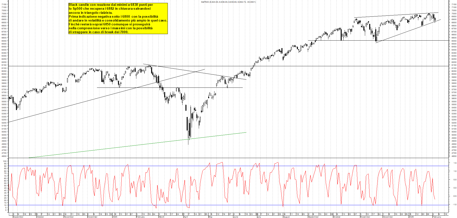 SP500: Black candle con reazione dai minimi a 6838 punti per lo Sp500 che recupera i 6882 in chiusura salvandosi ancora in triangolo rialzista. Prima indicazione negativa sotto i 6800 con la possibilità di andare in volatilità e consolidamento più ampio in quel caso. Finchè resterà soprai 6850 comunque si proseguirà nella compressione verso i massimi con la possibilità di strappare in caso di break dei 7000.