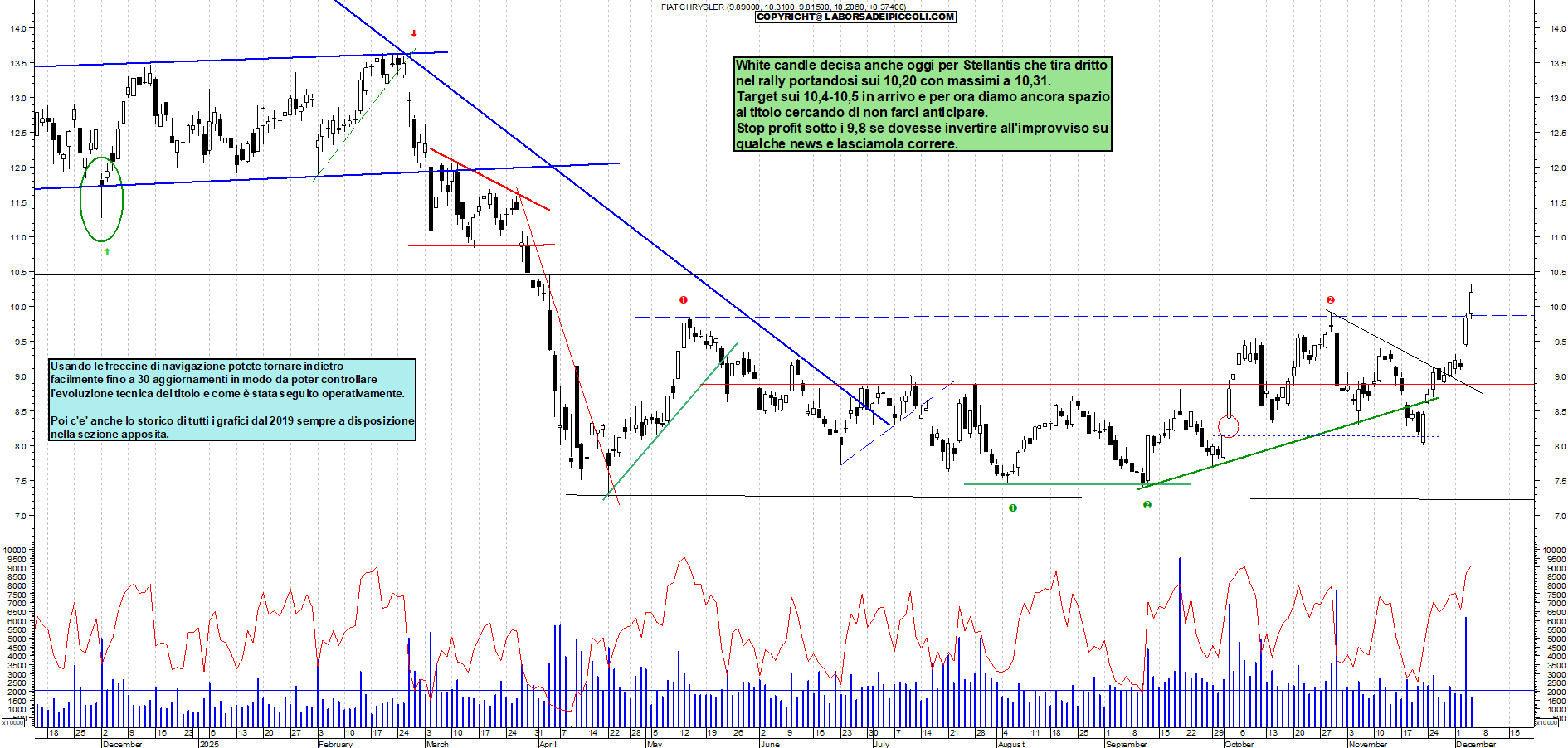 STELLANTIS: White candle decisa anche oggi per Stellantis che tira dritto nel rally portandosi sui 10,20 con massimi a 10,31. Target sui 10,4-10,5 in arrivo e per ora diamo ancora spazio al titolo cercando di non farci anticipare. Stop profit sotto i 9,8 se dovesse invertire all'improvviso su qualche news e lasciamola correre.