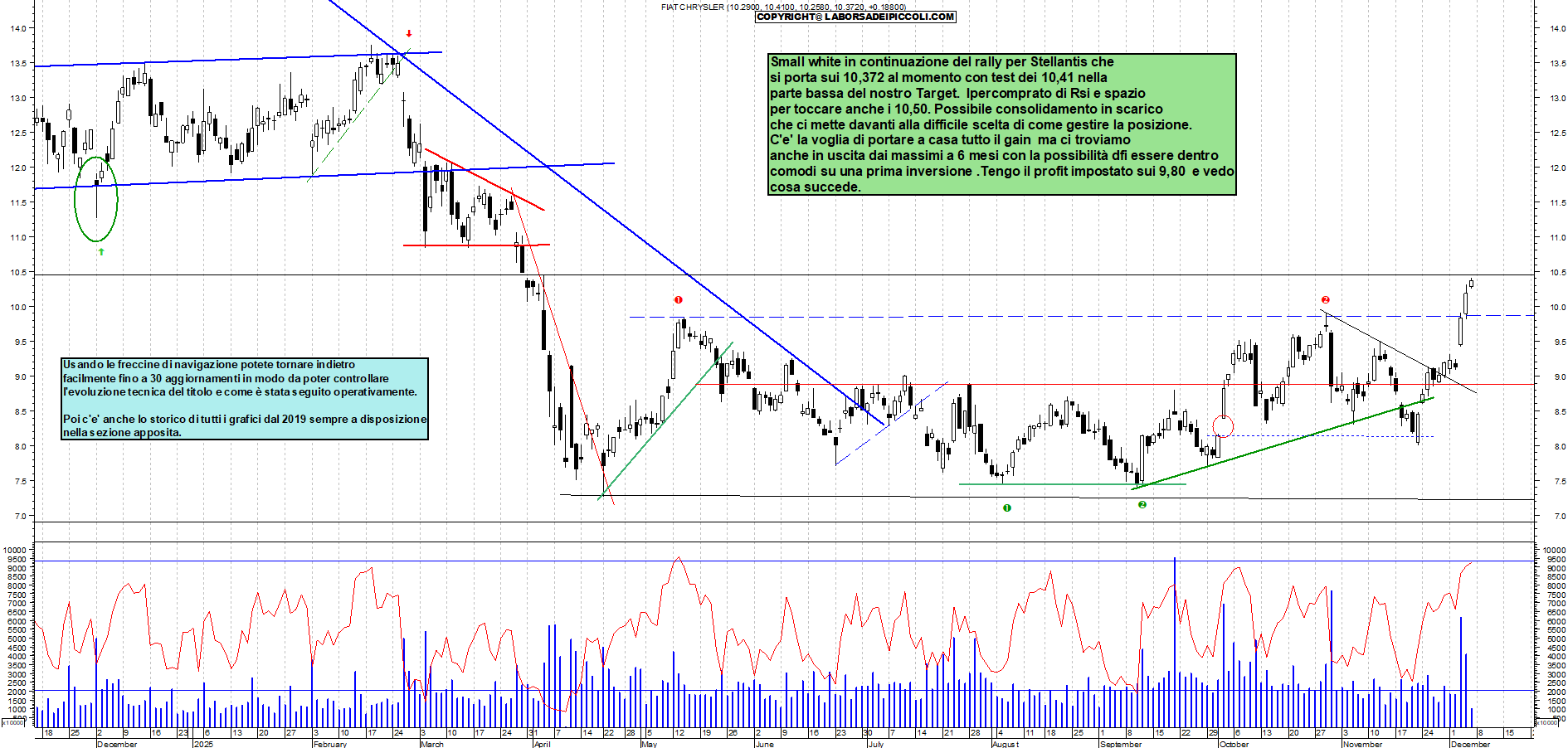 STELLANTIS: Small white in continuazione del rally per Stellantis che si porta sui 10,372 al momento con test dei 10,41 nella parte bassa del nostro Target. Ipercomprato di Rsi e spazio per toccare anche i 10,50. Possibile consolidamento in scarico che ci mette davanti alla difficile scelta di come gestire la posizione. C'e' la voglia di portare a casa tutto il gain ma ci troviamo anche in uscita dai massimi a 6 mesi con la possibilità dfi essere dentro comodi su una prima inversione .Tengo il profit impostato sui 9,80 e vedo cosa succede.