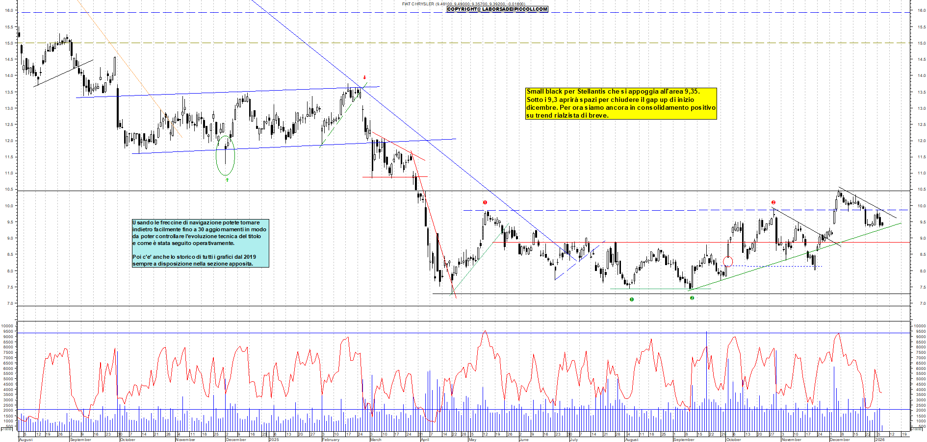 STELLANTIS: Small black per Stellantis che si appoggia all'area 9,35. Sotto i 9,3 aprirà spazi per chiudere il gap up di inizio dicembre. Per ora siamo ancora in consolidamento positivo su trend rialzista di breve.