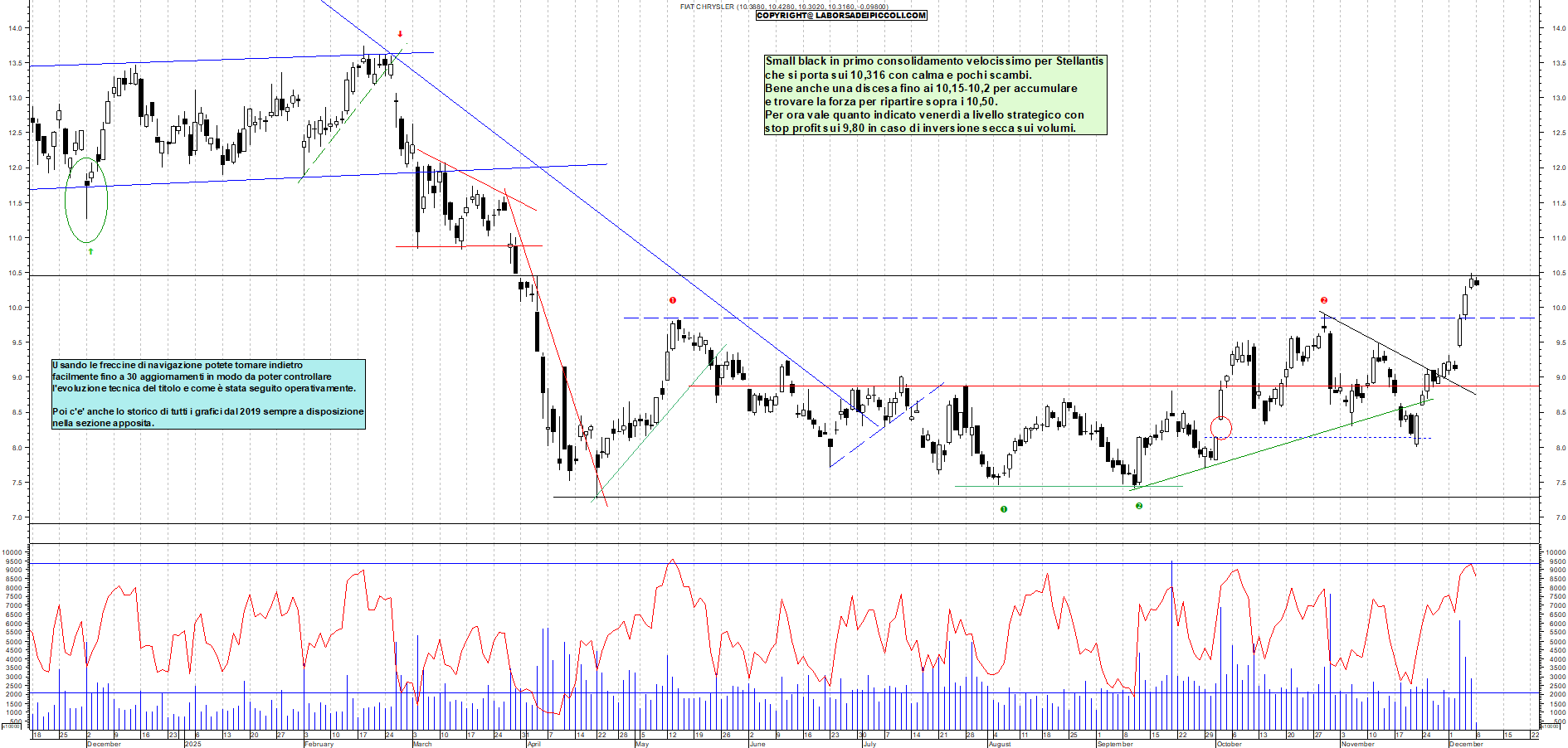 STELLANTIS: Small black in primo consolidamento velocissimo per Stellantis che si porta sui 10,316 con calma e pochi scambi. Bene anche una discesa fino ai 10,15-10,2 per accumulare e trovare la forza per ripartire sopra i 10,50. Per ora vale quanto indicato venerdì a livello strategico con stop profit sui 9,80 in caso di inversione secca sui volumi.
