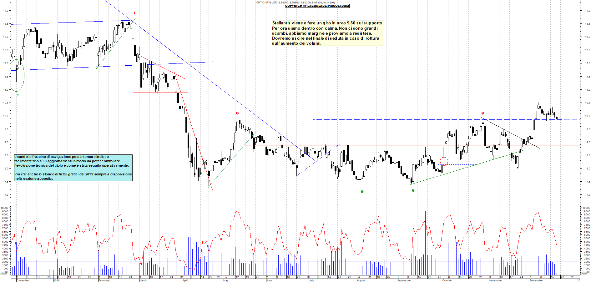 STELLANTIS: Stellantis viene a fare un giro in area 9,80 sul supporto. Per ora siamo dentro con calma. Non ci sono grandi scambi, abbiamo margine e proviamo a resistere. Dovremo uscire nel finale di seduta in caso di rottura sull'aumento dei volumi.