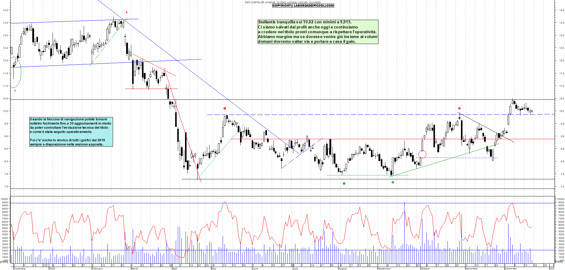 STELLANTIS: Stellantis tranquilla sui 10,02 con minimi a 9,915. Ci siamo salvati dal profit anche oggi e continuiamo a credere nel titolo pronti comunque a rispettare l'operatività. Abbiamo margine ma se dovesse venire giù insieme ai volumi domani dovremo saltar via e portare a casa il gain.