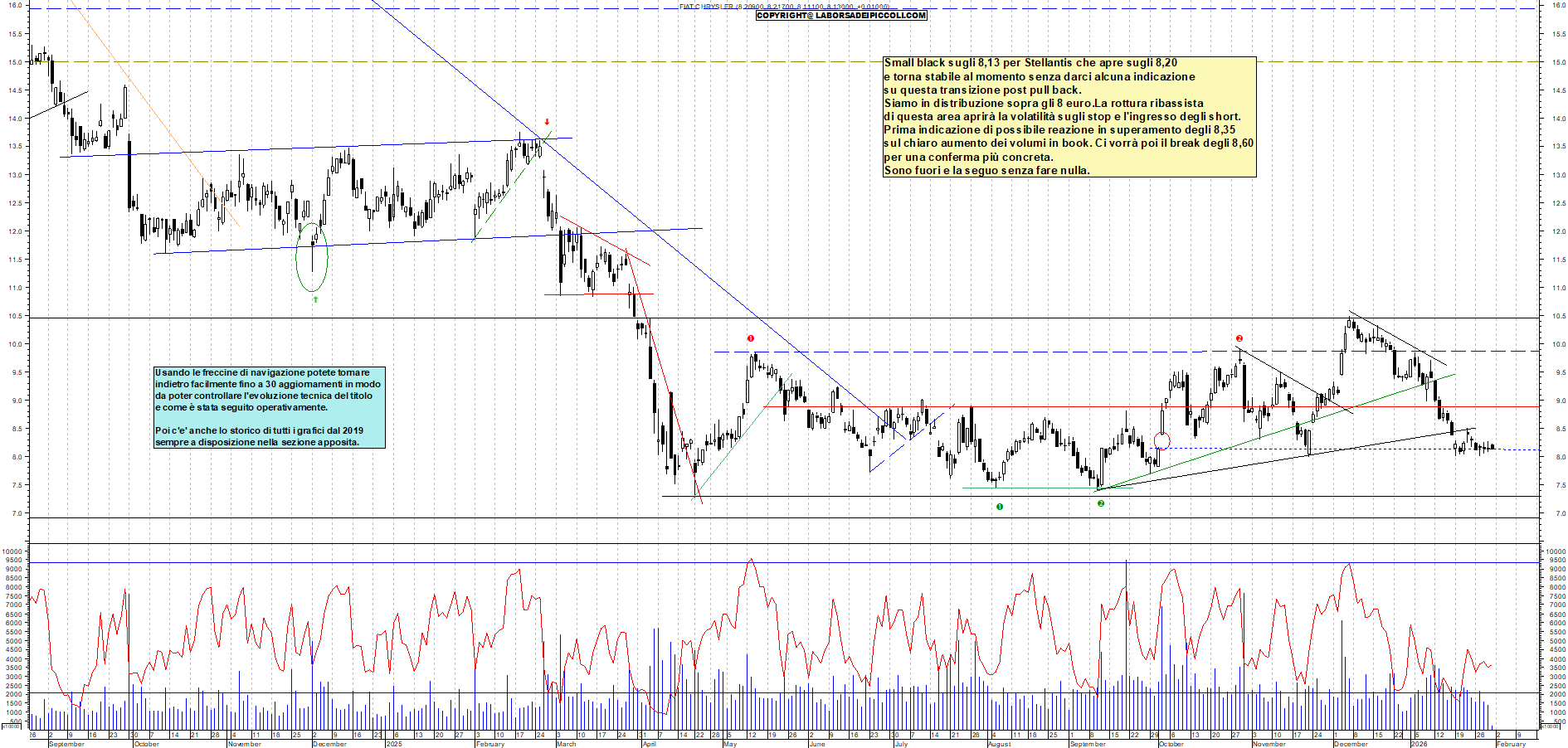 STELLANTIS: Small black sugli 8,13 per Stellantis che apre sugli 8,20 e torna stabile al momento senza darci alcuna indicazione su questa transizione post pull back. Siamo in distribuzione sopra gli 8 euro.La rottura ribassista di questa area aprirà la volatilità sugli stop e l'ingresso degli short. Prima indicazione di possibile reazione in superamento degli 8,35 sul chiaro aumento dei volumi in book. Ci vorrà poi il break degli 8,60 per una conferma più concreta. Sono fuori e la seguo senza fare nulla.