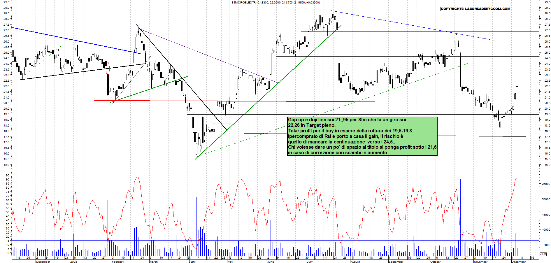 STM: Gap up e doji line sui 21,,95 per Stm che fa un giro sui 22,26 in Target pieno. Take profit per il buy in essere dalla rottura dei 19,5-19,8. Ipercomprato di Rsi e porto a casa il gain, il rischio è quello di mancare la continuazione verso i 24,5.. Chi volesse dare un po' di spazio al titolo si ponga profit sotto i 21,6 in caso di correzione con scambi in aumento.
