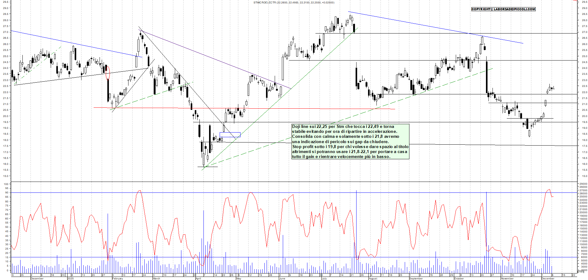 STM: Doji line sui 22,25 per Stm che tocca i 22,49 e torna stabile evitando per ora di ripartire in accelerazione. Consolida con calma e solamente sotto i 21,8 avremo una indicazione di pericolo sui gap da chiudere. Stop profit sotto i 19,8 per chi volesse dare spazio al titolo altrimenti si potranno usare i 21,8-22,1 per portare a casa tutto il gain e rientrare velocemente più in basso.