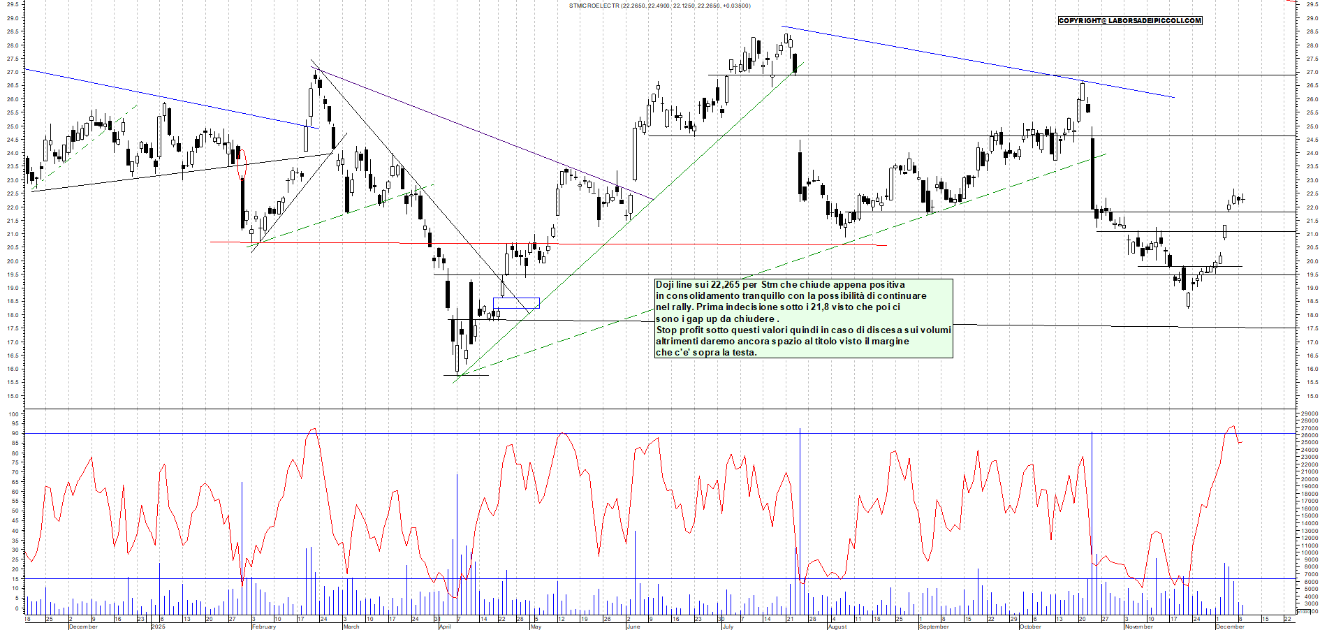 STM: Doji line sui 22,265 per Stm che chiude appena positiva in consolidamento tranquillo con la possibilità di continuare nel rally. Prima indecisione sotto i 21,8 visto che poi ci sono i gap up da chiudere . Stop profit sotto questi valori quindi in caso di discesa sui volumi altrimenti daremo ancora spazio al titolo visto il margine che c'e' sopra la testa.
