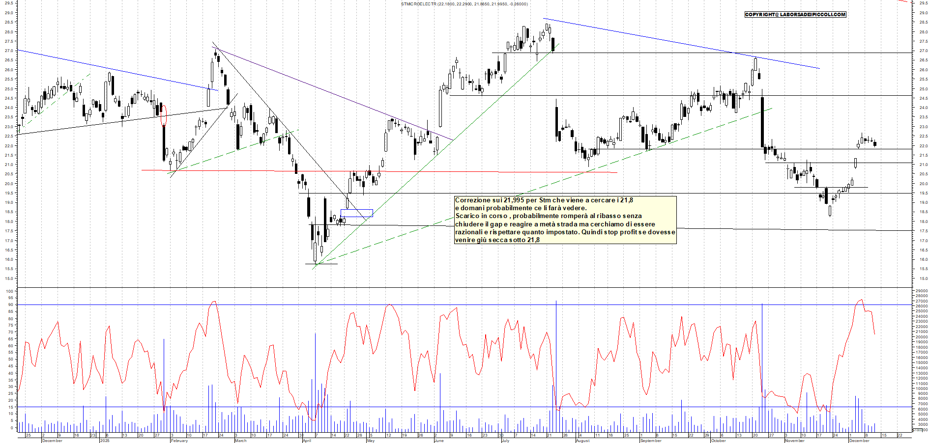 STM: Correzione sui 21,995 per Stm che viene a cercare i 21,8 e domani probabilmente ce li farà vedere. Scarico in corso , probabilmente romperà al ribasso senza chiudere il gap e reagire a metà strada ma cerchiamo di essere razionali e rispettare quanto impostato. Quindi stop profit se dovesse venire giù secca sotto 21,8