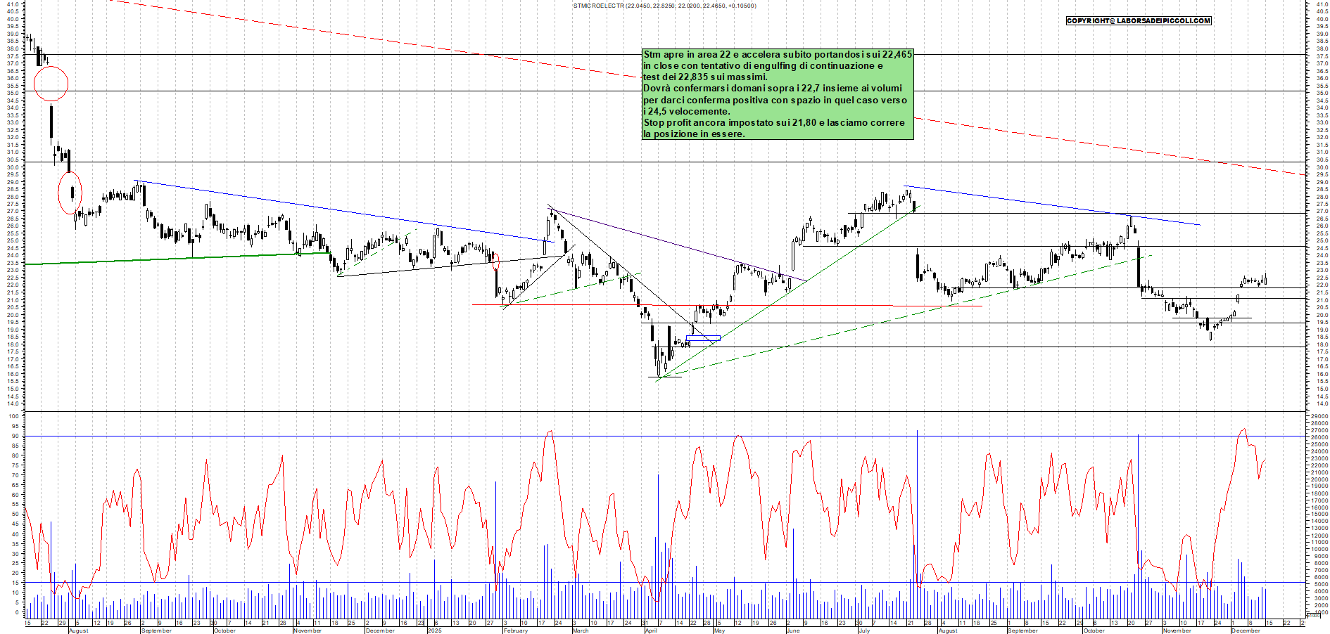 STM: Stm apre in area 22 e accelera subito portandosi sui 22,465 in close con tentativo di engulfing di continuazione e test dei 22,835 sui massimi. Dovrà confermarsi domani sopra i 22,7 insieme ai volumi per darci conferma positiva con spazio in quel caso verso i 24,5 velocemente. Stop profit ancora impostato sui 21,80 e lasciamo correre la posizione in essere.