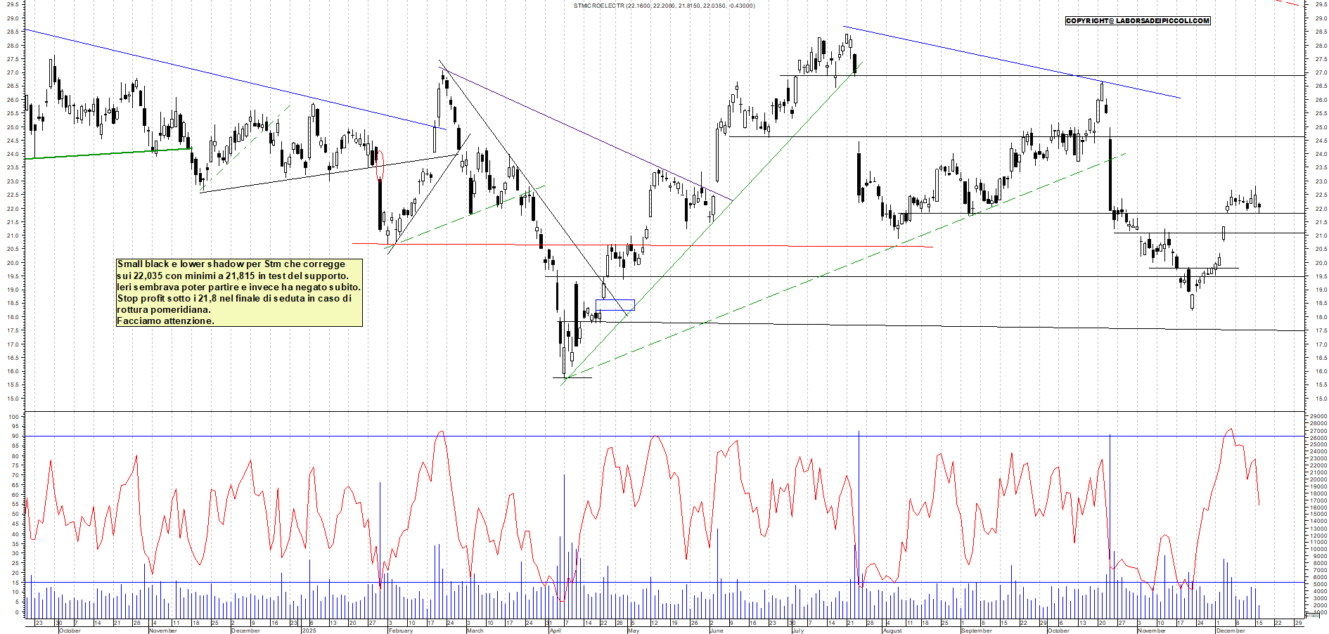 STM: Small black e lower shadow per Stm che corregge sui 22,035 con minimi a 21,815 in test del supporto. Ieri sembrava poter partire e invece ha negato subito. Stop profit sotto i 21,8 nel finale di seduta in caso di rottura pomeridiana. Facciamo attenzione.