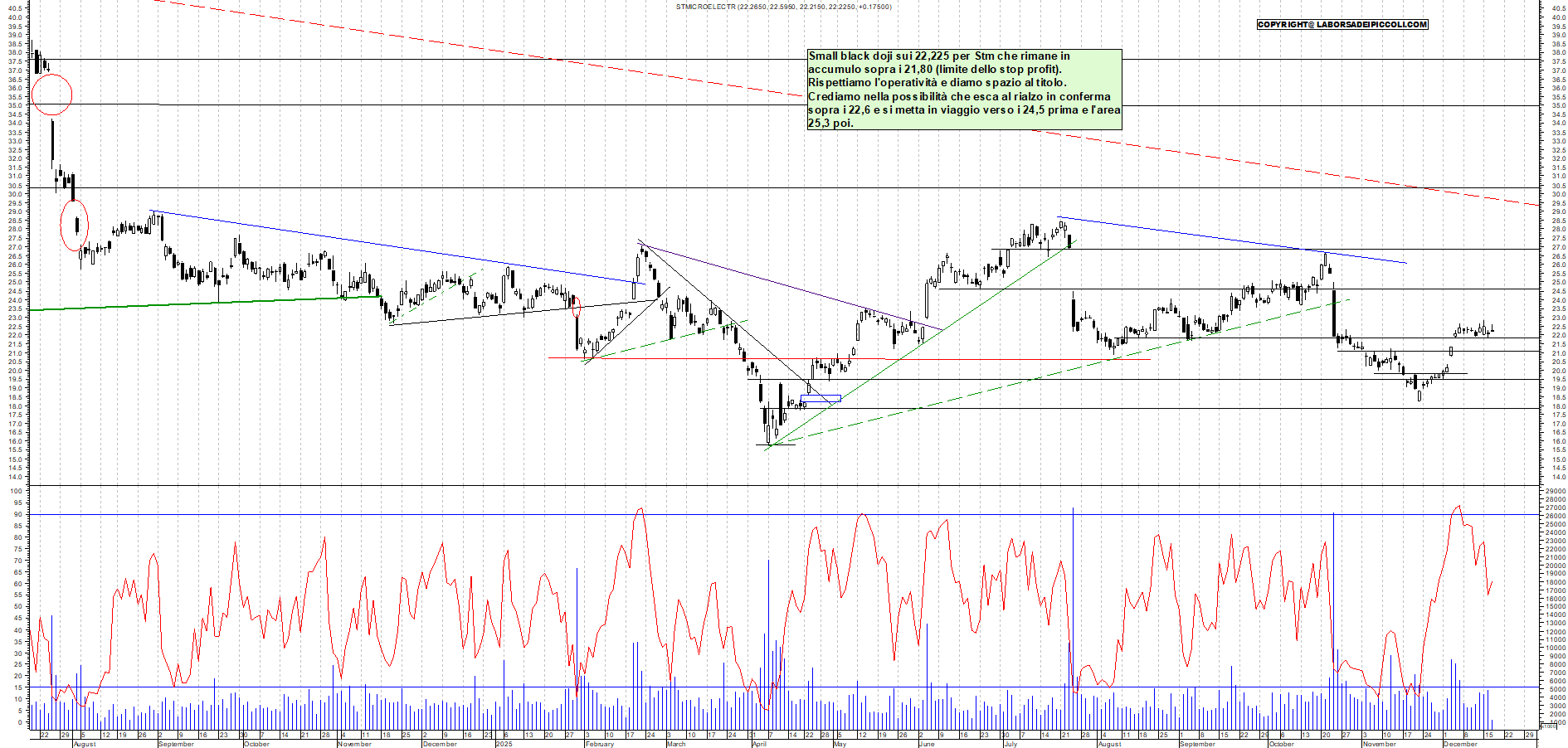 STM: Small black doji sui 22,225 per Stm che rimane in accumulo sopra i 21,80 (limite dello stop profit). Rispettiamo l'operatività e diamo spazio al titolo. Crediamo nella possibilità che esca al rialzo in conferma sopra i 22,6 e si metta in viaggio verso i 24,5 prima e l'area 25,3 poi.