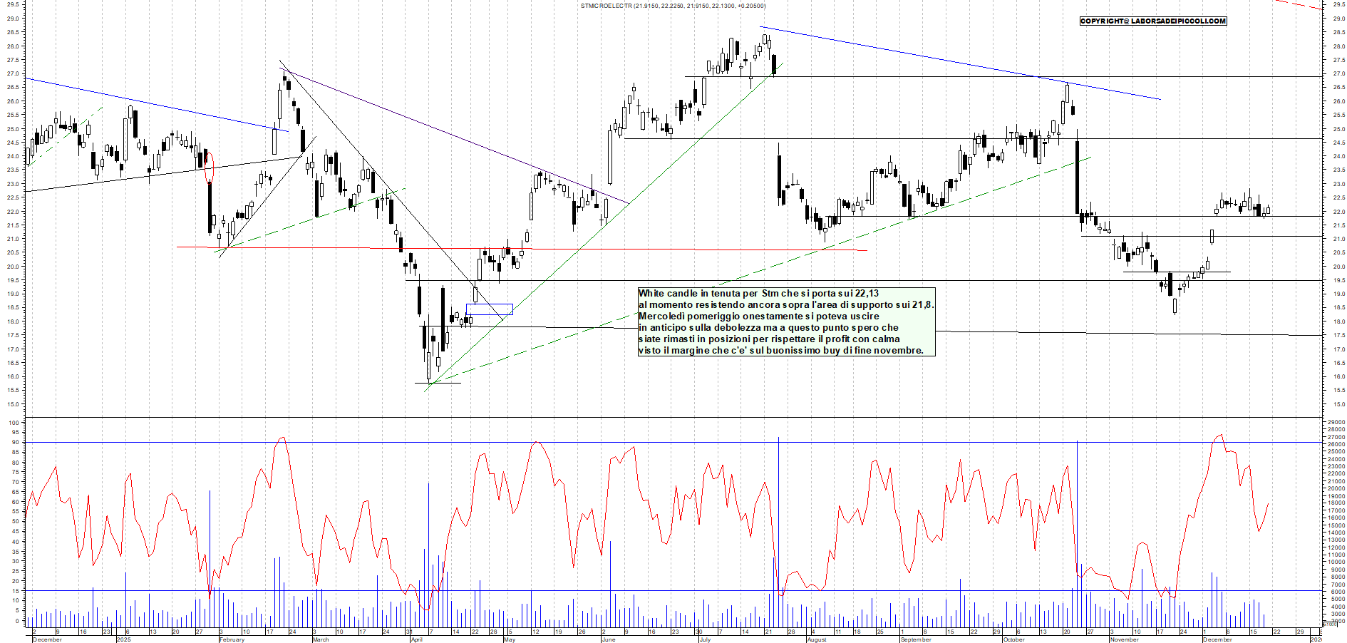 STM: White candle in tenuta per Stm che si porta sui 22,13 al momento resistendo ancora sopra l'area di supporto sui 21,8. Mercoledì pomeriggio onestamente si poteva uscire in anticipo sulla debolezza ma a questo punto spero che siate rimasti in posizioni per rispettare il profit con calma visto il margine che c'e' sul buonissimo buy di fine novembre.
