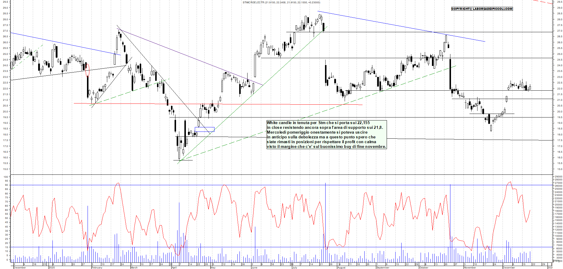 STM: White candle in tenuta per Stm che si porta sui 22,155 in close resistendo ancora sopra l'area di supporto sui 21,8. Mercoledì pomeriggio onestamente si poteva uscire in anticipo sulla debolezza ma a questo punto spero che siate rimasti in posizioni per rispettare il profit con calma visto il margine che c'e' sul buonissimo buy di fine novembre.
