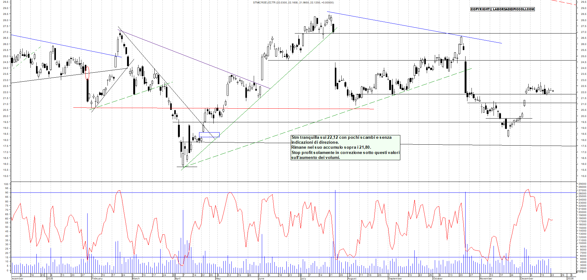 STM: Stm tranquilla sui 22,12 con pochi scambi e senza indicazioni di direzione. Rimane nel suo accumulo sopra i 21,80. Stop profit solamente in correzione sotto questi valori sull'aumento dei volumi.