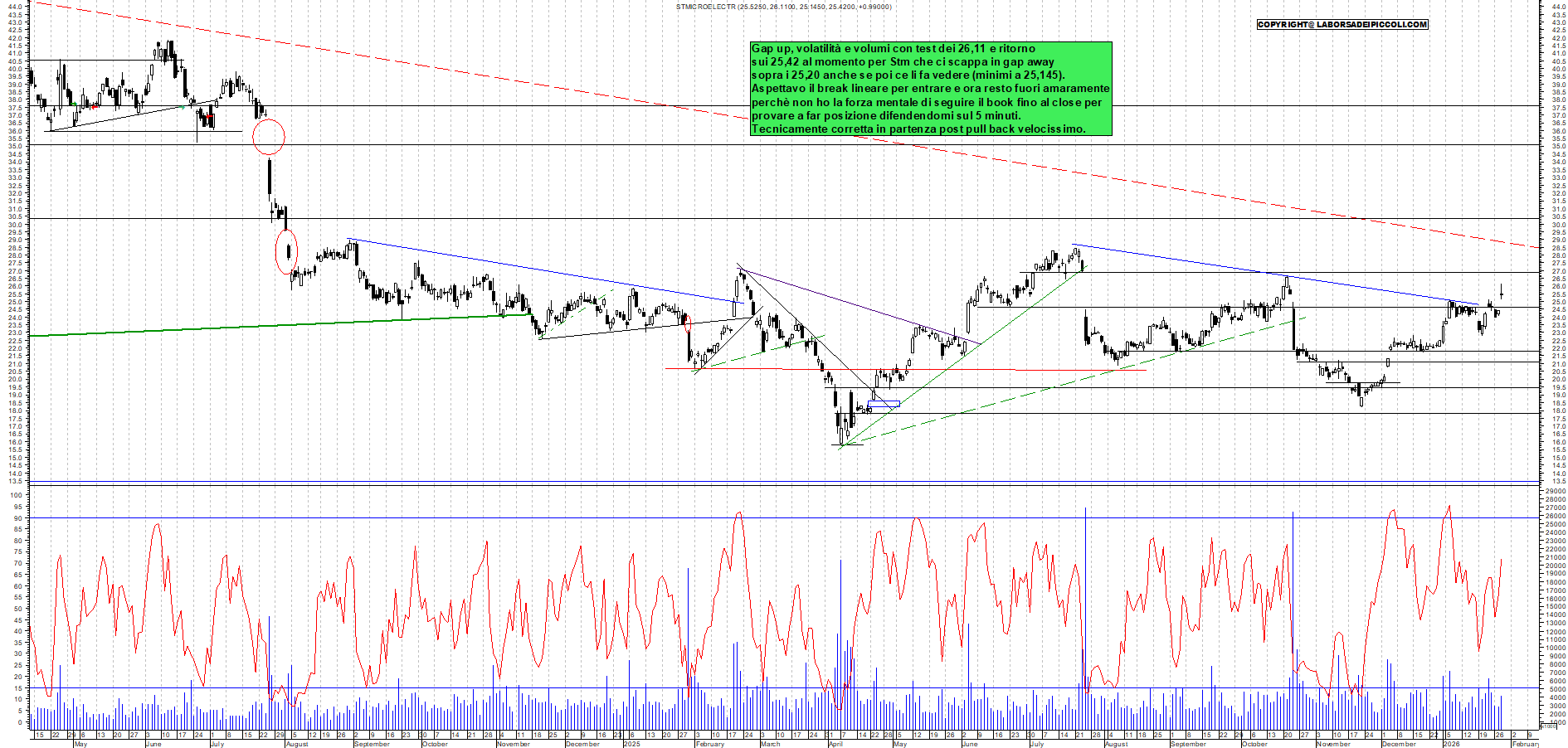 STM: Gap up, volatilità e volumi con test dei 26,11 e ritorno sui 25,42 al momento per Stm che ci scappa in gap away sopra i 25,20 anche se poi ce li fa vedere (minimi a 25,145). Aspettavo il break lineare per entrare e ora resto fuori amaramente perchè non ho la forza mentale di seguire il book fino al close per provare a far posizione difendendomi sul 5 minuti. Tecnicamente corretta in partenza post pull back velocissimo.