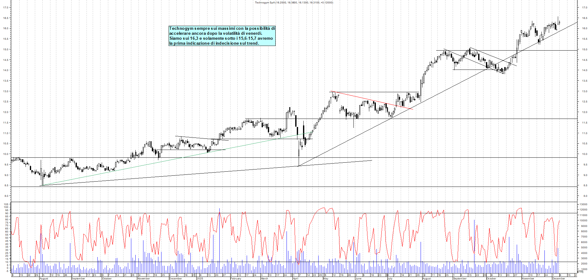 TECHNOGYM: Technogym sempre sui massimi con la possibilità di accelerare ancora dopo la volatilità di venerdì. Siamo sui 16,3 e solamente sotto i 15,6-15,7 avremo la prima indicazione di indecisione sul trend.