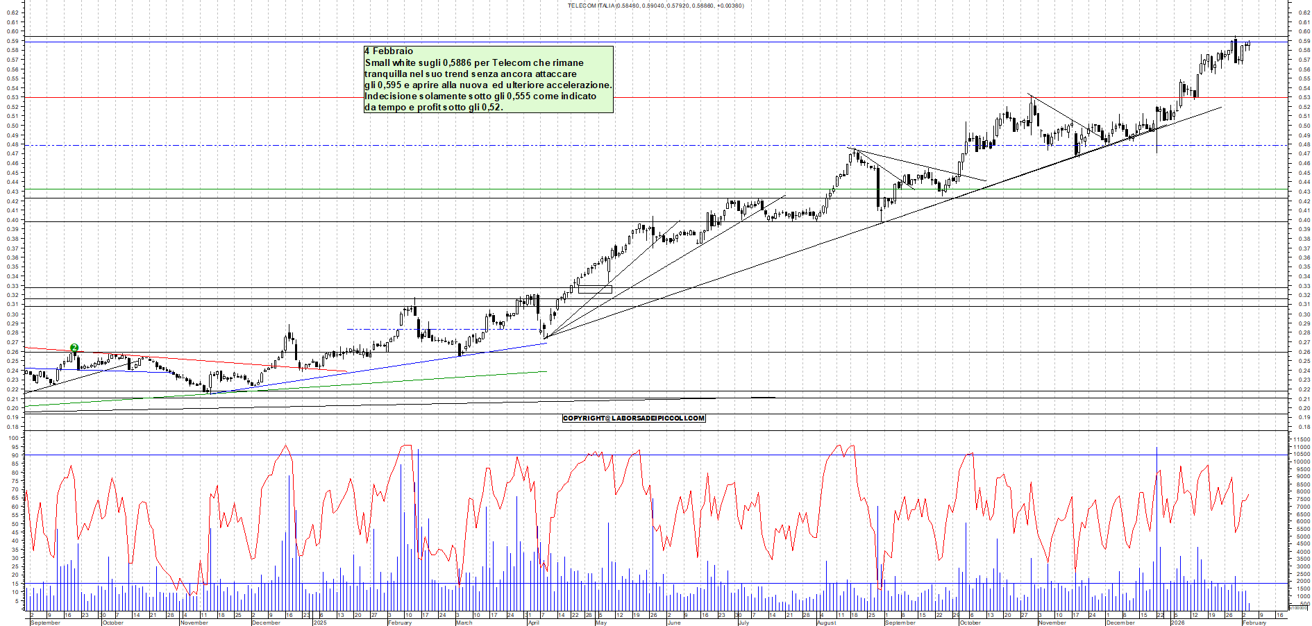 TELECOM: 4 Febbraio Small white sugli 0,5886 per Telecom che rimane tranquilla nel suo trend senza ancora attaccare gli 0,595 e aprire alla nuova ed ulteriore accelerazione. Indecisione solamente sotto gli 0,555 come indicato da tempo e profit sotto gli 0,52.