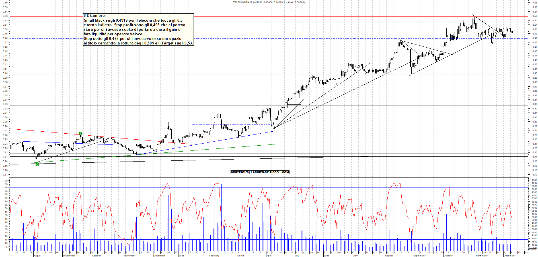 TELECOM: 8 Dicembre Small black sugli 0,4919 per Telecom che tocca gli 0,5 e torna indietro. Stop profit sotto gli 0,493 che ci poteva stare per chi avesse scelto di portare a casa il gain e fare liquidità per operare veloce. Stop sotto gli 0,478 per chi invece volesse dar spazio al titolo cercando la rottura degli 0,505 e il Target sugli 0,53.