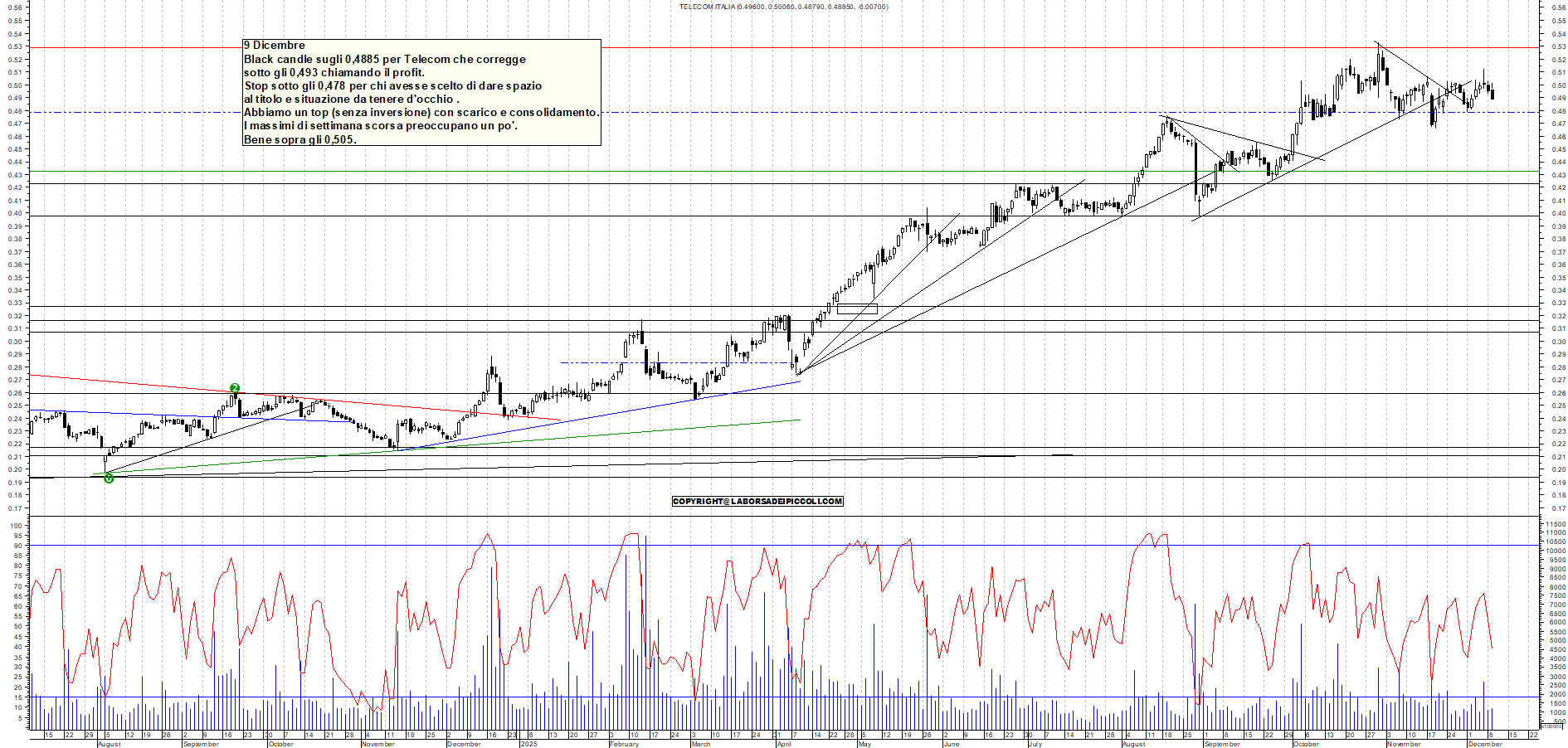 TELECOM: 9 Dicembre Black candle sugli 0,4885 per Telecom che corregge sotto gli 0,493 chiamando il profit. Stop sotto gli 0,478 per chi avesse scelto di dare spazio al titolo e situazione da tenere d'occhio . Abbiamo un top (senza inversione) con scarico e consolidamento. I massimi di settimana scorsa preoccupano un po'. Bene sopra gli 0,505.