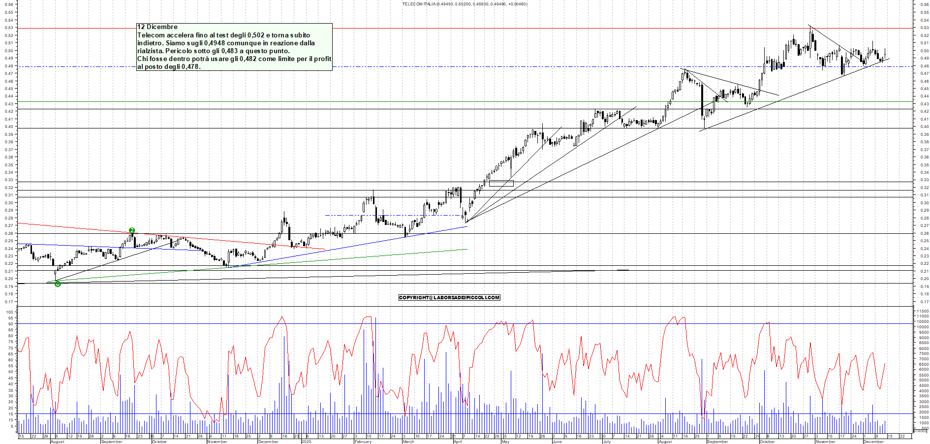 TELECOM: 12 Dicembre Telecom accelera fino al test degli 0,502 e torna subito indietro. Siamo sugli 0,4948 comunque in reazione dalla rialzista. Pericolo sotto gli 0,483 a questo punto. Chi fosse dentro potrà usare gli 0,482 come limite per il profit al posto degli 0,478.