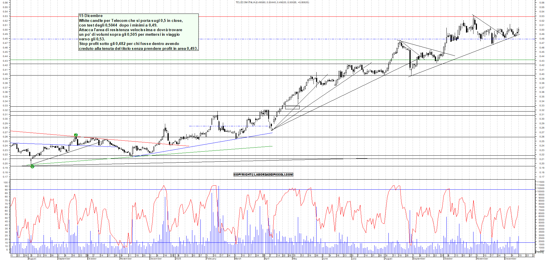 TELECOM: 15 Dicembre White candle per Telecom che si porta sugl 0,5 in close, con test degli 0,5044 dopo i minimi a 0,49. Attacca l'area di resistenza velocissima e dovrà trovare un po' di volumi sopra gli 0,505 per mettersi in viaggio verso gli 0,53. Stop profit sotto gli 0,482 per chi fosse dentro avendo creduto alla tenuta del titolo senza prendere profit in area 0,493.