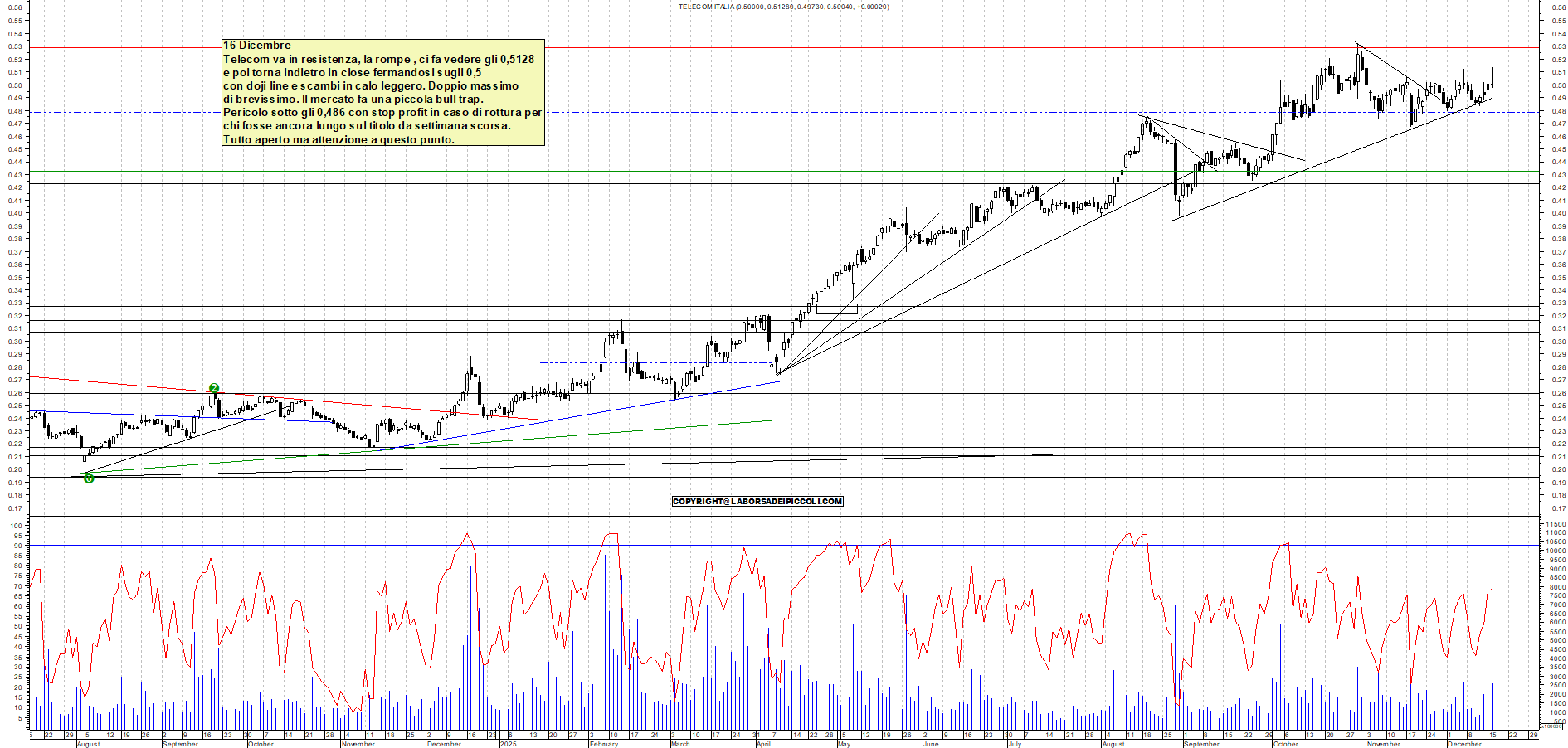 TELECOM: 16 Dicembre Telecom va in resistenza, la rompe , ci fa vedere gli 0,5128 e poi torna indietro in close fermandosi sugli 0,5 con doji line e scambi in calo leggero. Doppio massimo di brevissimo. Il mercato fa una piccola bull trap. Pericolo sotto gli 0,486 con stop profit in caso di rottura per chi fosse ancora lungo sul titolo da settimana scorsa. Tutto aperto ma attenzione a questo punto.