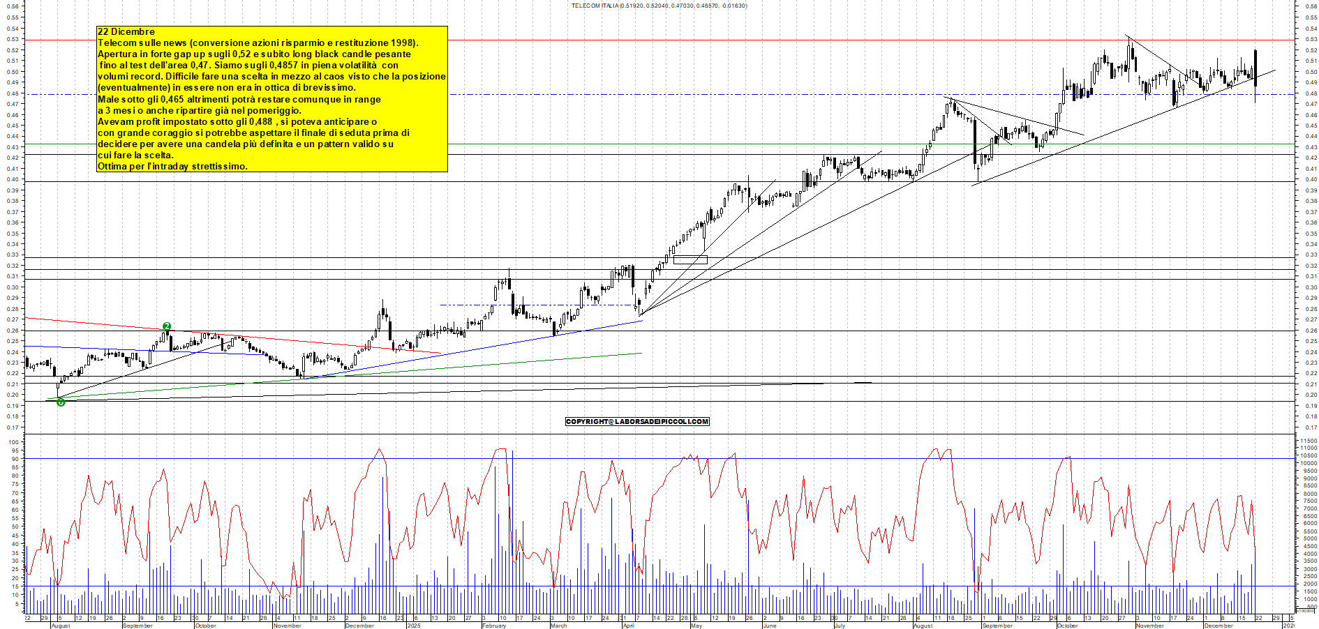 TELECOM: 22 Dicembre Telecom sulle news (conversione azioni risparmio e restituzione 1998). Apertura in forte gap up sugli 0,52 e subito long black candle pesante fino al test dell'area 0,47. Siamo sugli 0,4857 in piena volatilità con volumi record. Difficile fare una scelta in mezzo al caos visto che la posizione (eventualmente) in essere non era in ottica di brevissimo. Male sotto gli 0,465 altrimenti potrà restare comunque in range a 3 mesi o anche ripartire già nel pomeriggio. Avevam profit impostato sotto gli 0,488 , si poteva anticipare o con grande coraggio si potrebbe aspettare il finale di seduta prima di decidere per avere una candela più definita e un pattern valido su cui fare la scelta. Ottima per l'intraday strettissimo.