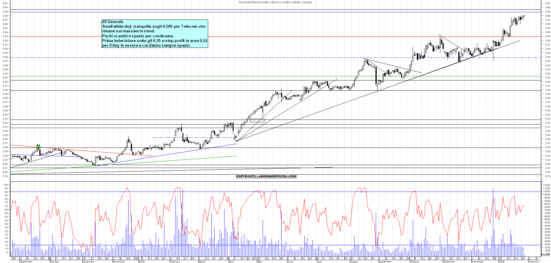 TELECOM: 28 Gennaio Small white doji tranquilla sugli 0,580 per Telecom che rimane sui massimi in trend. Pochi scambi e spazio per continuare. Prima indecisione sotto gli 0,55 e stop profit in area 0,52 per il buy in essere a cui diamo sempre spazio.