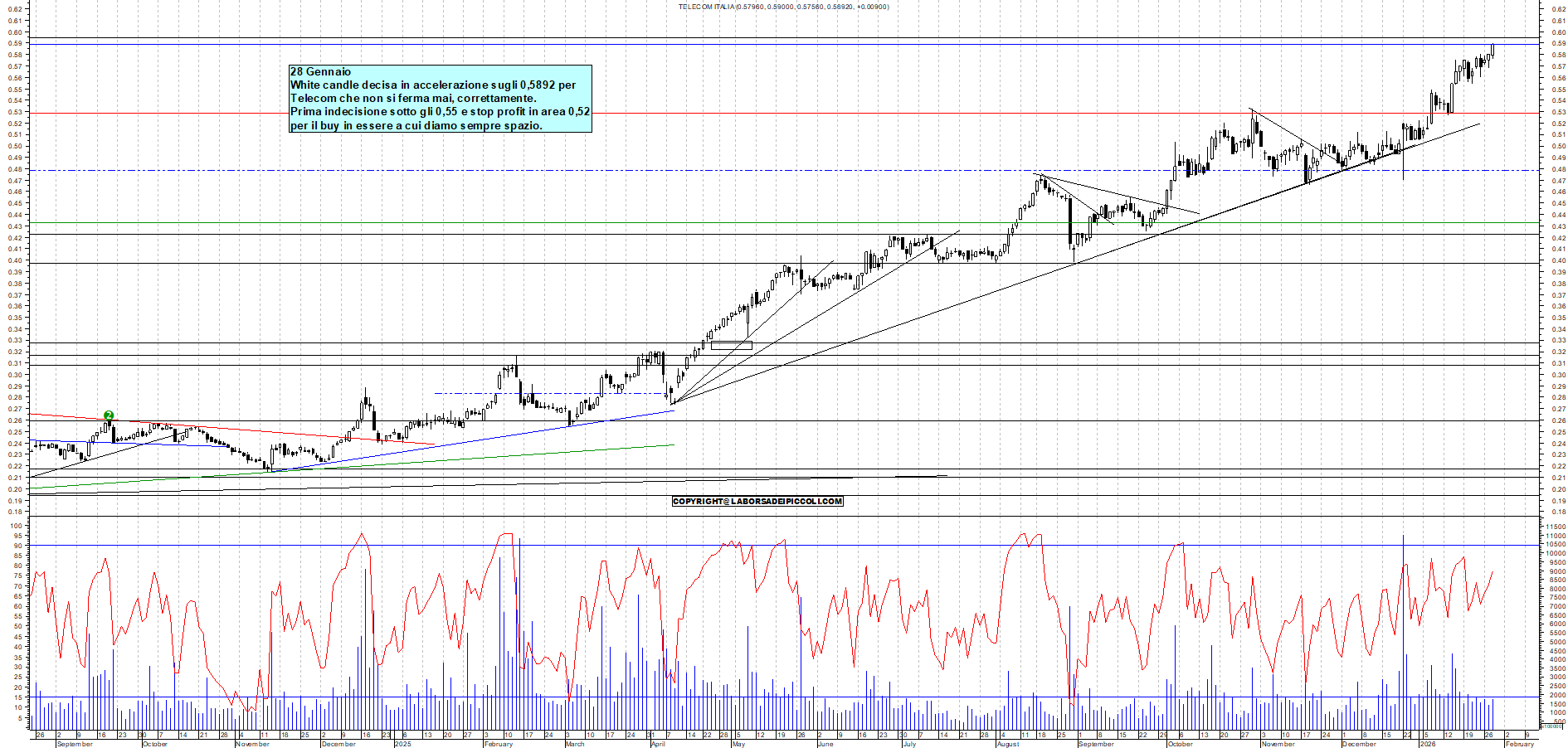 TELECOM: 28 Gennaio White candle decisa in accelerazione sugli 0,5892 per Telecom che non si ferma mai, correttamente. Prima indecisione sotto gli 0,55 e stop profit in area 0,52 per il buy in essere a cui diamo sempre spazio.