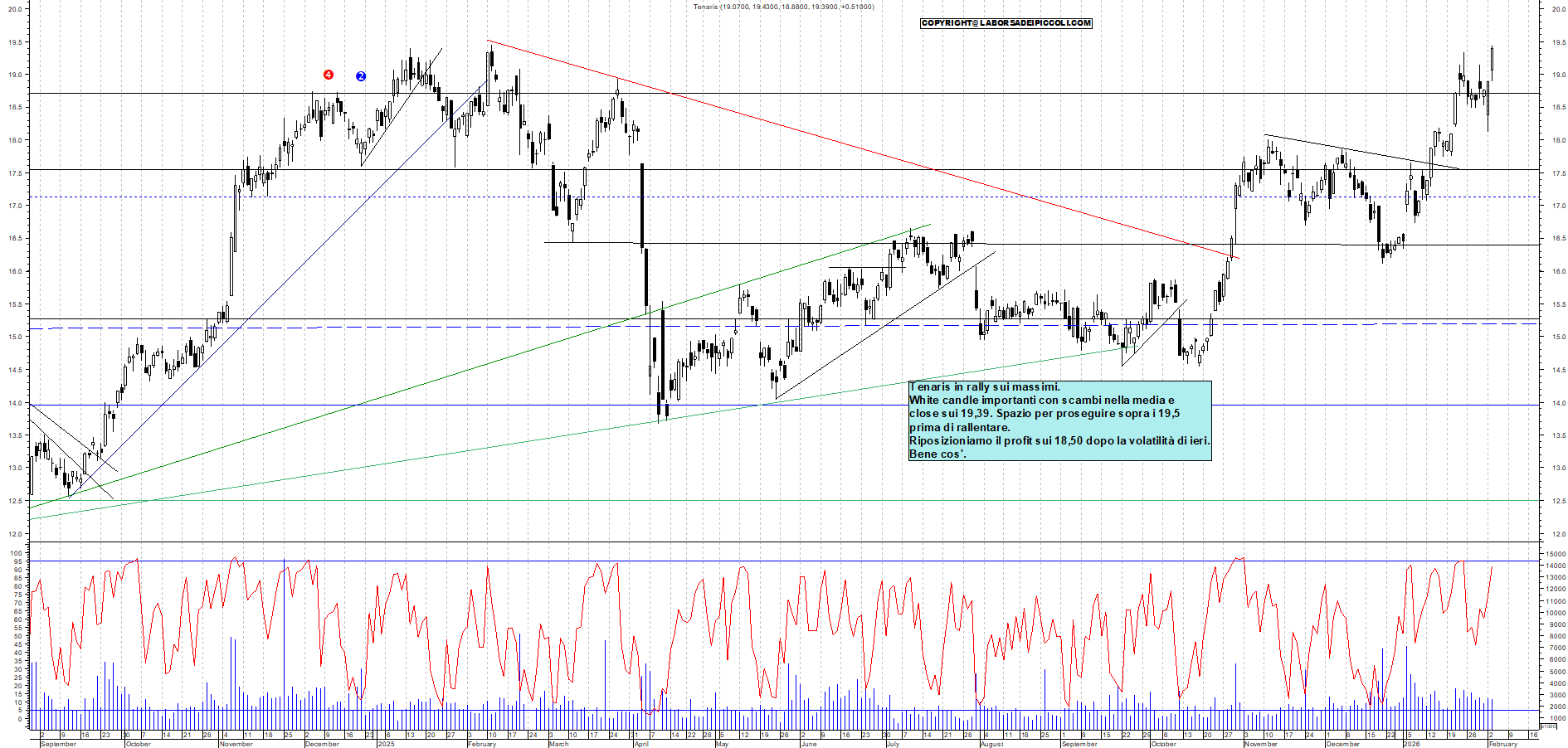 TENARIS: Tenaris in rally sui massimi. White candle importanti con scambi nella media e close sui 19,39. Spazio per proseguire sopra i 19,5 prima di rallentare. Riposizioniamo il profit sui 18,50 dopo la volatilità di ieri. Bene cos'.