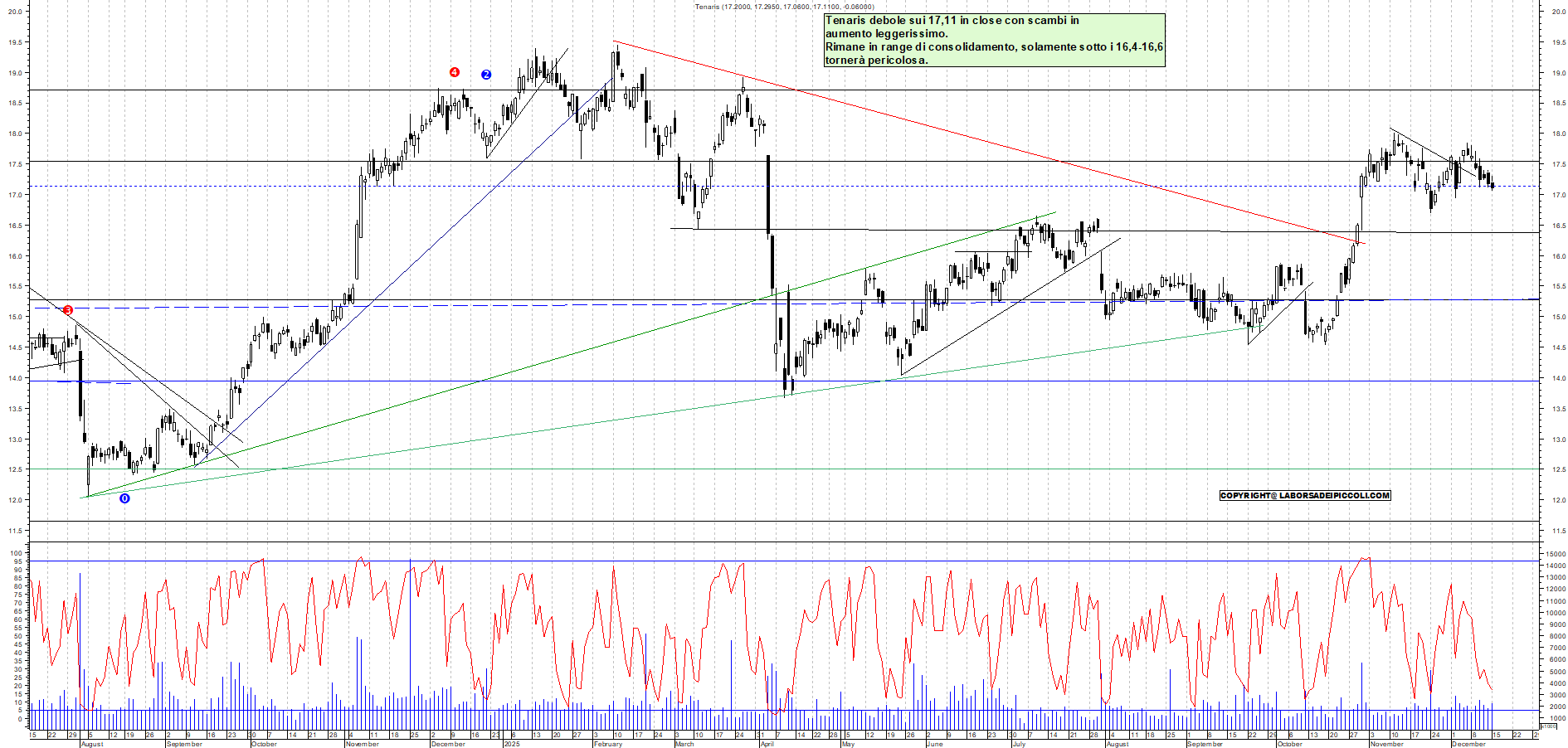 TENARIS: Tenaris debole sui 17,11 in close con scambi in aumento leggerissimo. Rimane in range di consolidamento, solamente sotto i 16,4-16,6 tornerà pericolosa.