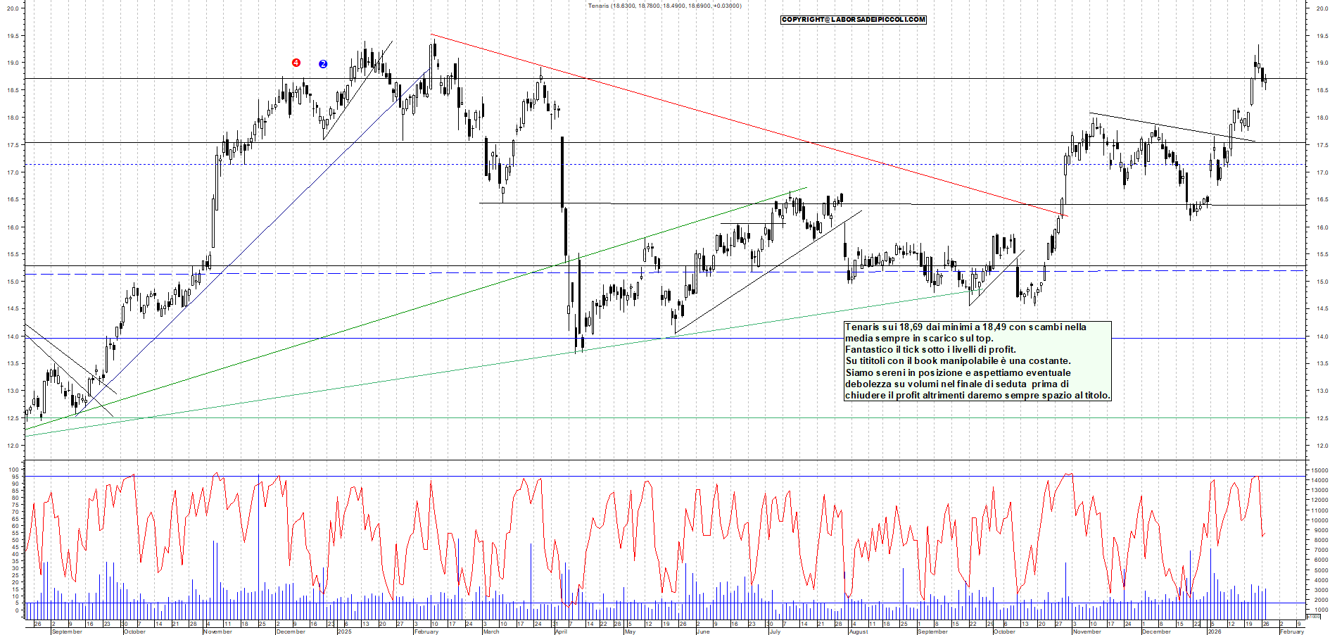TENARIS: Tenaris sui 18,69 dai minimi a 18,49 con scambi nella media sempre in scarico sul top. Fantastico il tick sotto i livelli di profit. Su tititoli con il book manipolabile è una costante. Siamo sereni in posizione e aspettiamo eventuale debolezza su volumi nel finale di seduta prima di chiudere il profit altrimenti daremo sempre spazio al titolo.