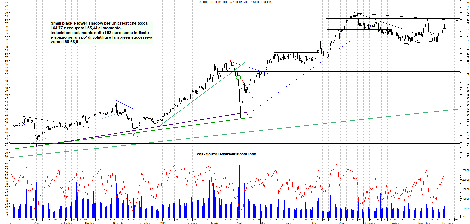 UNICREDIT: Small black e lower shadow per Unicredit che tocca i 64,77 e recupera i 65,34 al momento. Indecisione solamente sotto i 63 euro come indicato e spazio per un po' di volatilità e la ripresa successiva verso i 68-68,5.