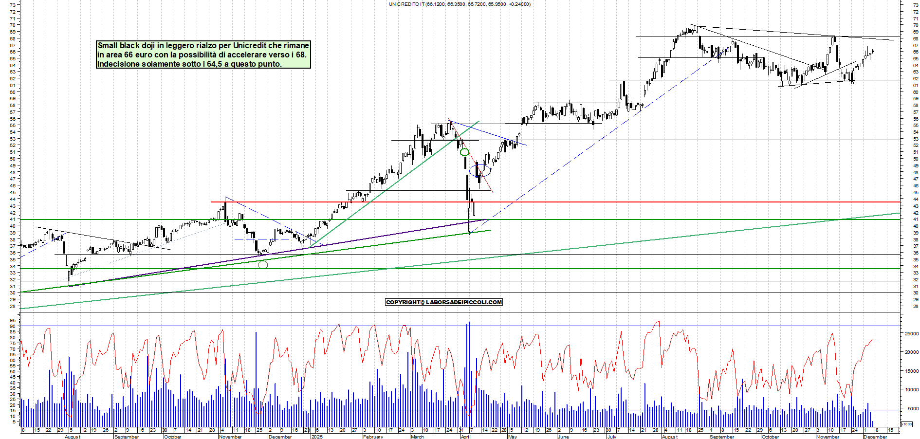 UNICREDIT: Small black doji in leggero rialzo per Unicredit che rimane in area 66 euro con la possibilità di accelerare verso i 68. Indecisione solamente sotto i 64,5 a questo punto.