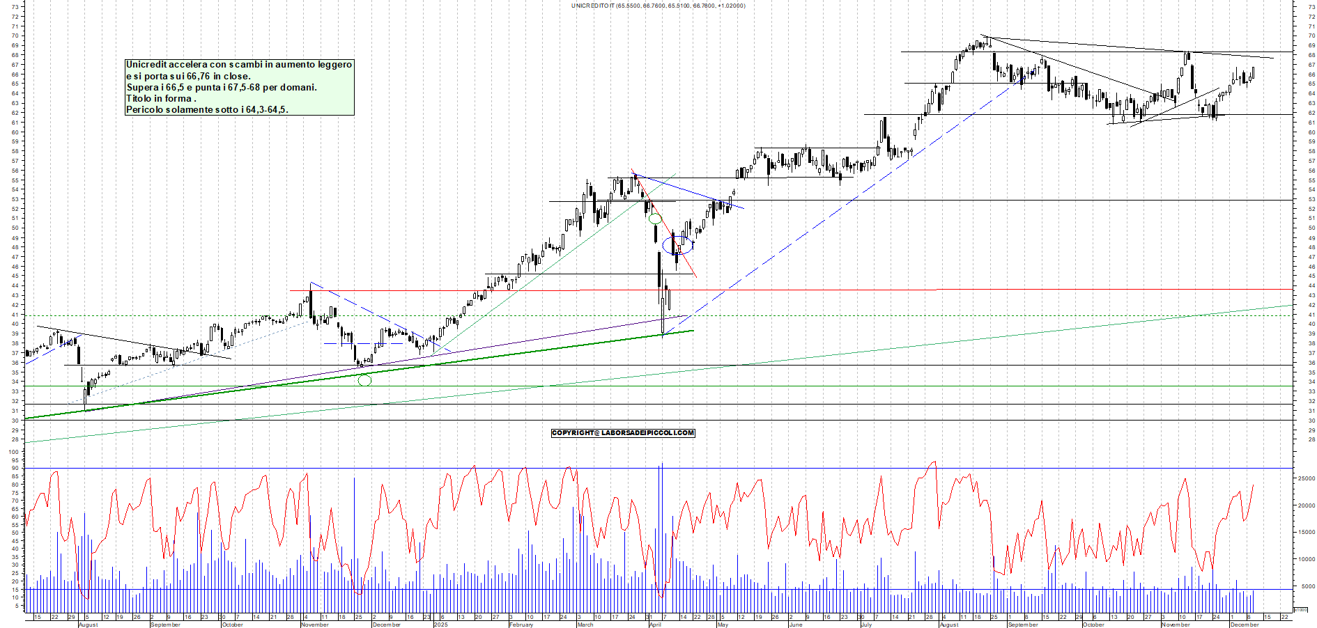 UNICREDIT: Unicredit accelera con scambi in aumento leggero e si porta sui 66,76 in close. Supera i 66,5 e punta i 67,5-68 per domani. Titolo in forma . Pericolo solamente sotto i 64,3-64,5.