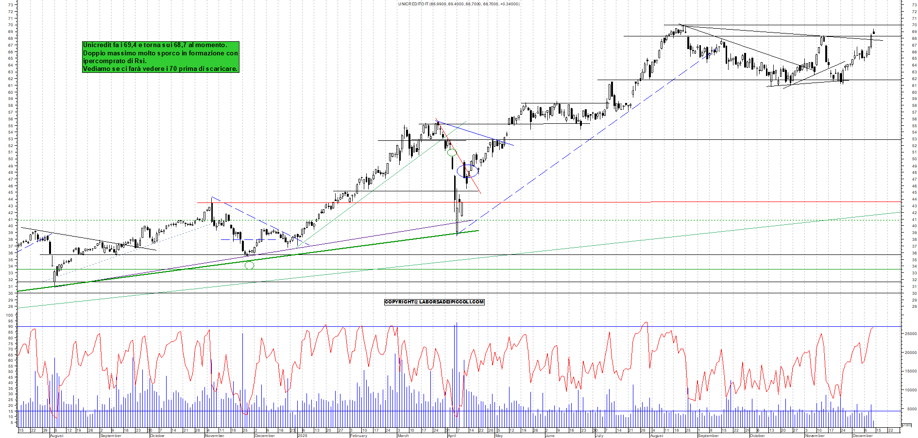 UNICREDIT: Unicredit fa i 69,4 e torna sui 68,7 al momento. Doppio massimo molto sporco in formazione con ipercomprato di Rsi. Vediamo se ci farà vedere i 70 prima di scaricare.