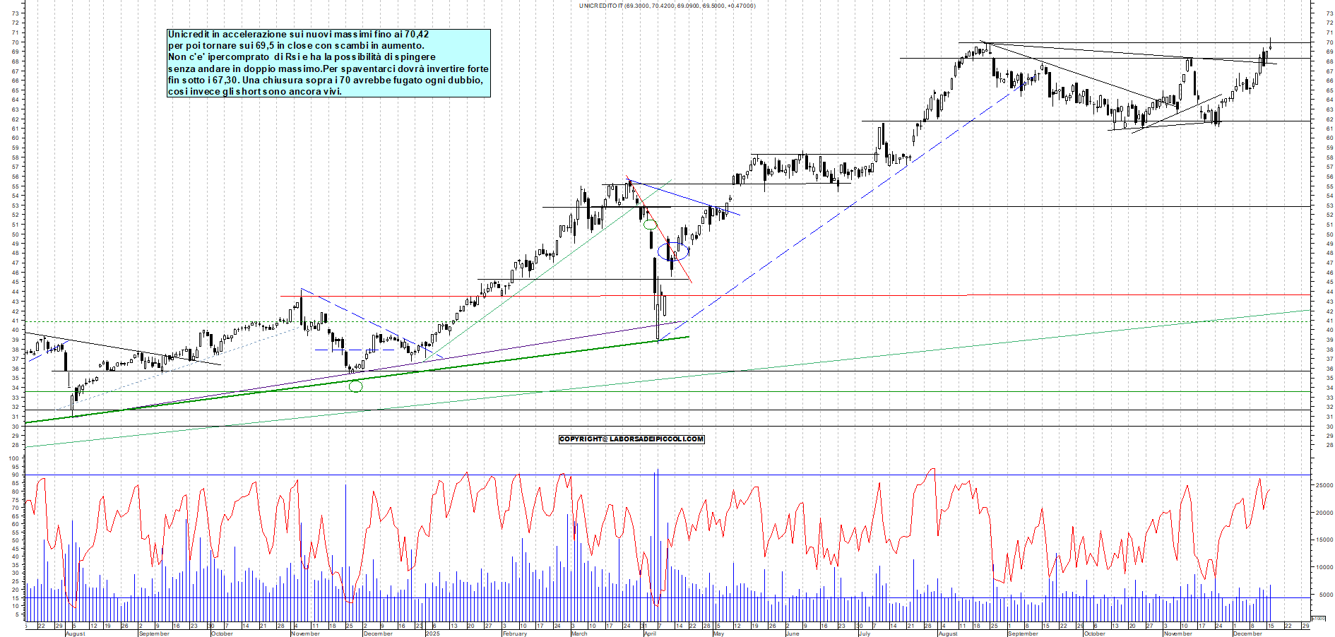 UNICREDIT: Unicredit in accelerazione sui nuovi massimi fino ai 70,42 per poi tornare sui 69,5 in close con scambi in aumento. Non c'e' ipercomprato di Rsi e ha la possibilità di spingere senza andare in doppio massimo.Per spaventarci dovrà invertire forte fin sotto i 67,30. Una chiusura sopra i 70 avrebbe fugato ogni dubbio, cosi invece gli short sono ancora vivi.