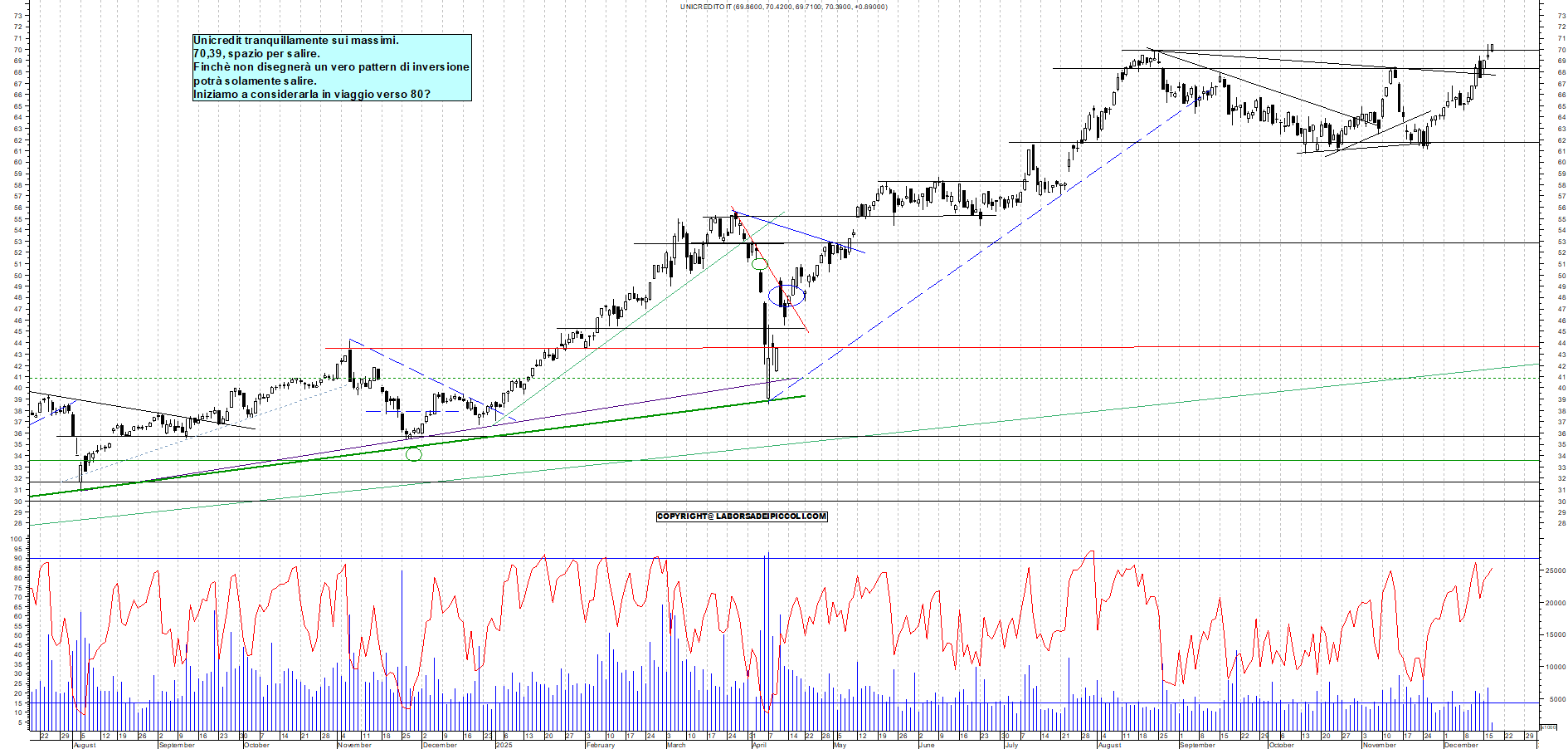 UNICREDIT: Unicredit tranquillamente sui massimi. 70,39, spazio per salire. Finchè non disegnerà un vero pattern di inversione potrà solamente salire. Iniziamo a considerarla in viaggio verso 80?