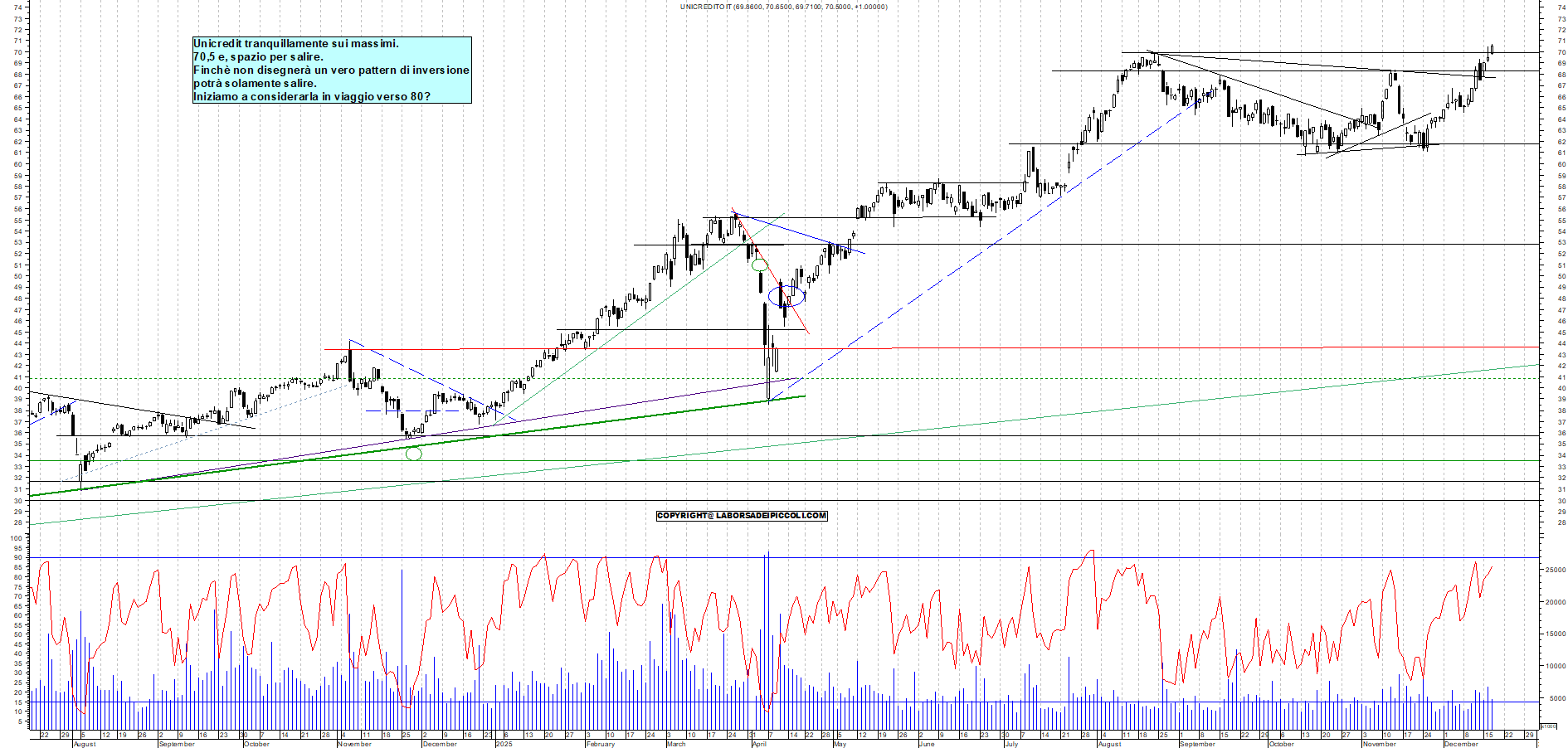 UNICREDIT: Unicredit tranquillamente sui massimi. 70,5 e, spazio per salire. Finchè non disegnerà un vero pattern di inversione potrà solamente salire. Iniziamo a considerarla in viaggio verso 80?