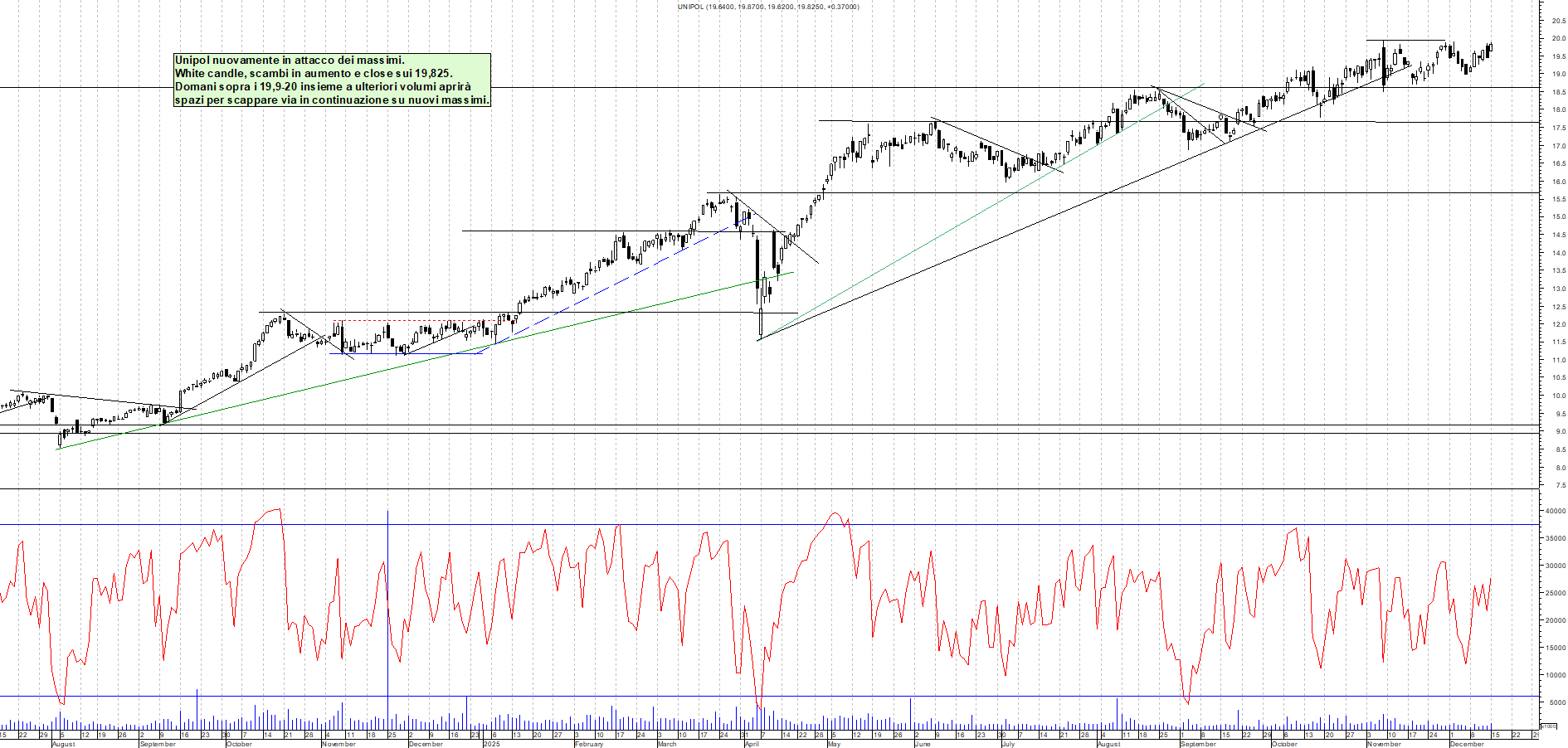 UNIPOL: Unipol nuovamente in attacco dei massimi. White candle, scambi in aumento e close sui 19,825. Domani sopra i 19,9-20 insieme a ulteriori volumi aprirà spazi per scappare via in continuazione su nuovi massimi.