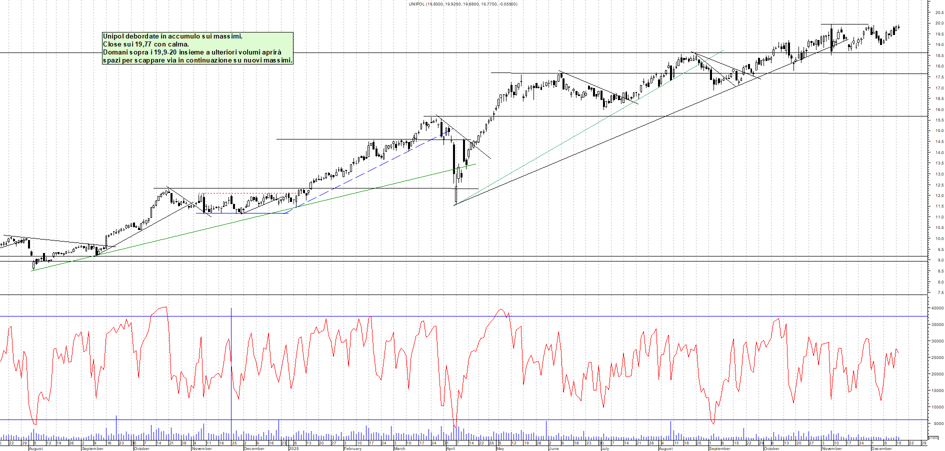 UNIPOL: Unipol debordate in accumulo sui massimi. Close sui 19,77 con calma. Domani sopra i 19,9-20 insieme a ulteriori volumi aprirà spazi per scappare via in continuazione su nuovi massimi.
