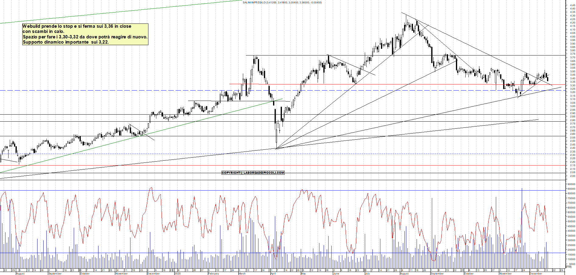 WEBUILD: Webuild prende lo stop e si ferma sui 3,36 in close con scambi in calo. Spazio per fare i 3,30-3,32 da dove potrà reagire di nuovo. Supporto dinamico importante sui 3,22.