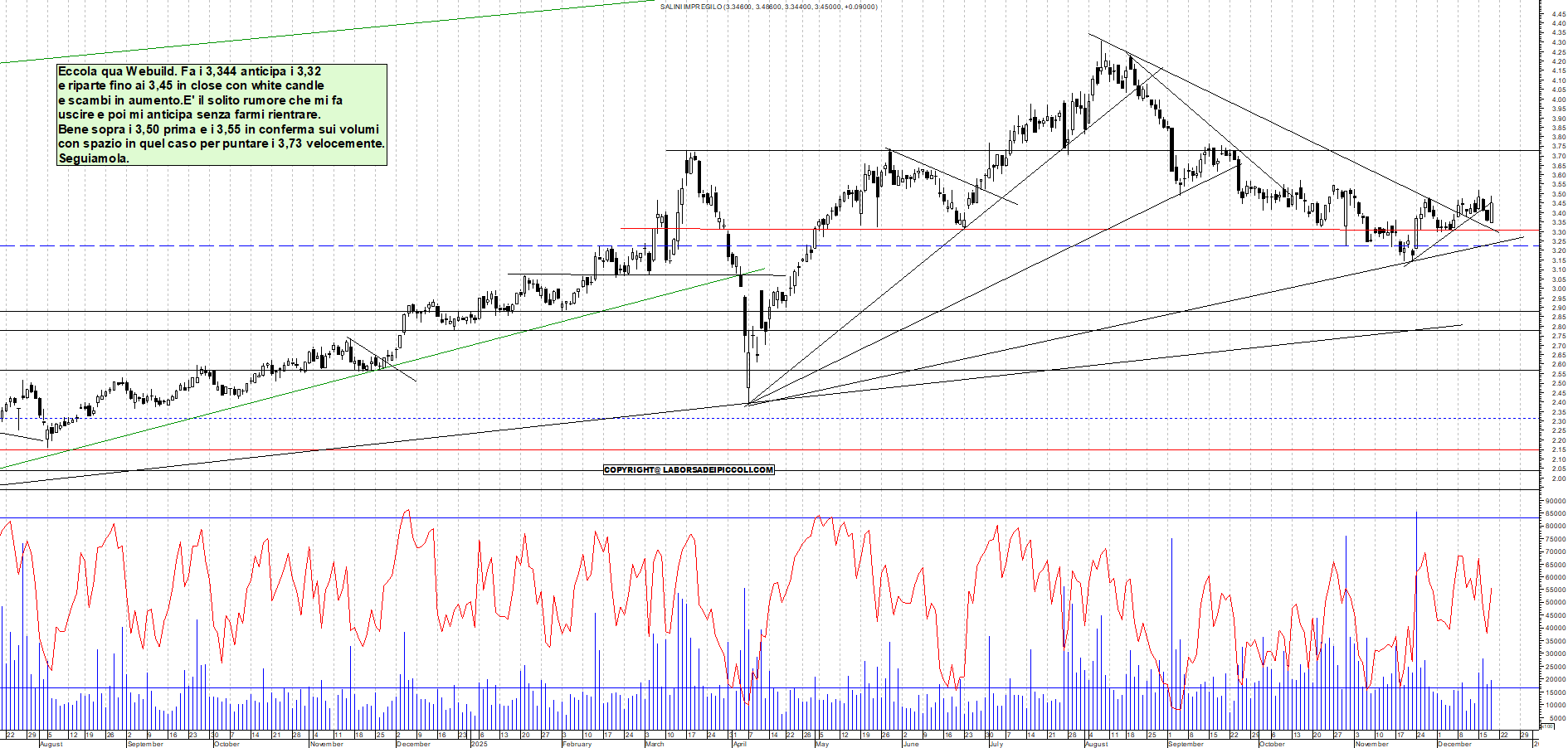 WEBUILD: Eccola qua Webuild. Fa i 3,344 anticipa i 3,32 e riparte fino ai 3,45 in close con white candle e scambi in aumento.E' il solito rumore che mi fa uscire e poi mi anticipa senza farmi rientrare. Bene sopra i 3,50 prima e i 3,55 in conferma sui volumi con spazio in quel caso per puntare i 3,73 velocemente. Seguiamola.