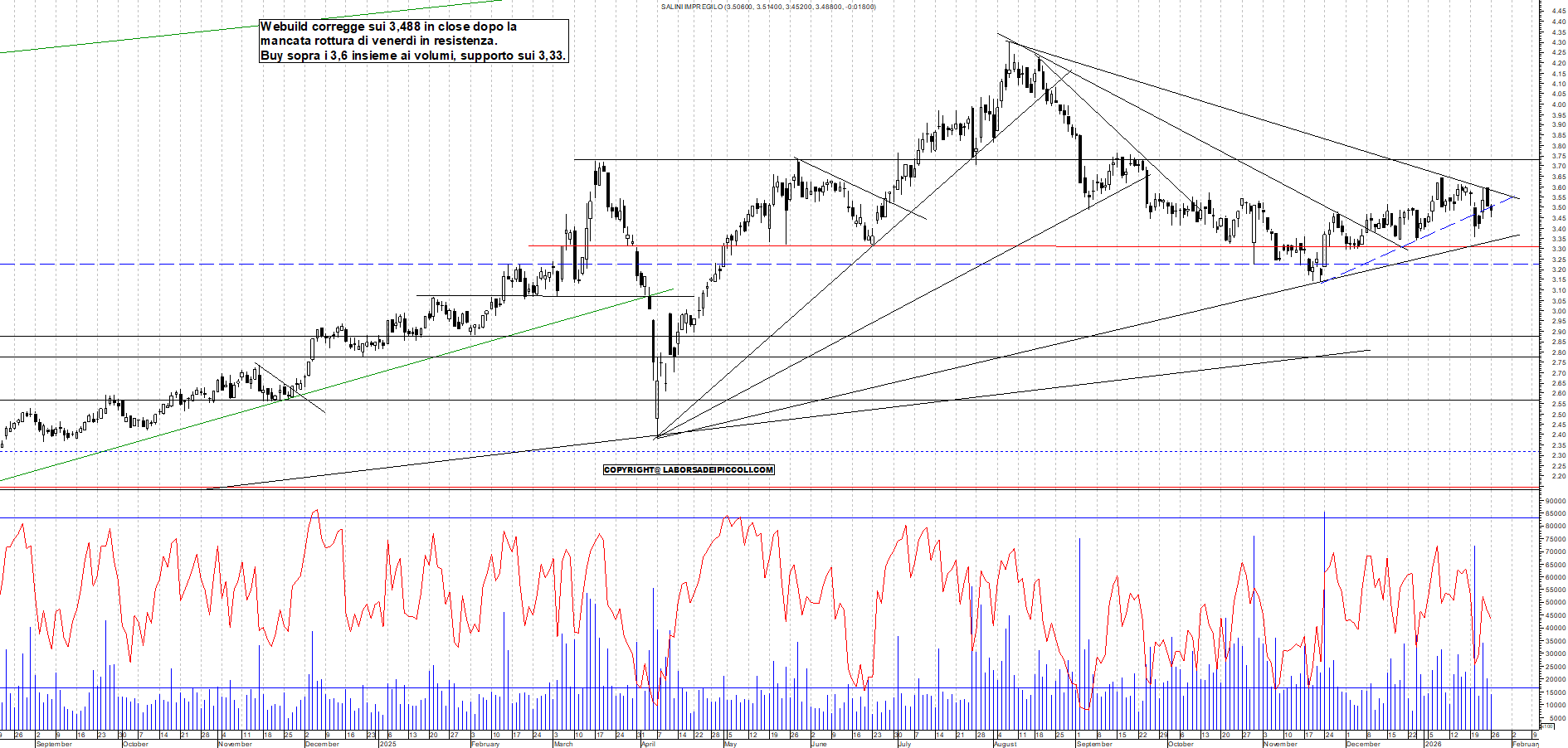 WEBUILD: Webuild corregge sui 3,488 in close dopo la mancata rottura di venerdì in resistenza. Buy sopra i 3,6 insieme ai volumi, supporto sui 3,33.