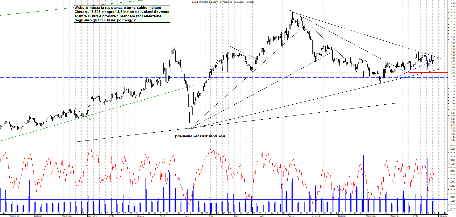 WEBUILD: Webuild ritesta la resistenza e torna subito indietro. Close sui 3,528 e sopra i 3,6 insieme ai volumi dovremo entrare in buy e provare a prendere l'accelerazione. Seguiamo gli scambi nel pomeriggio.